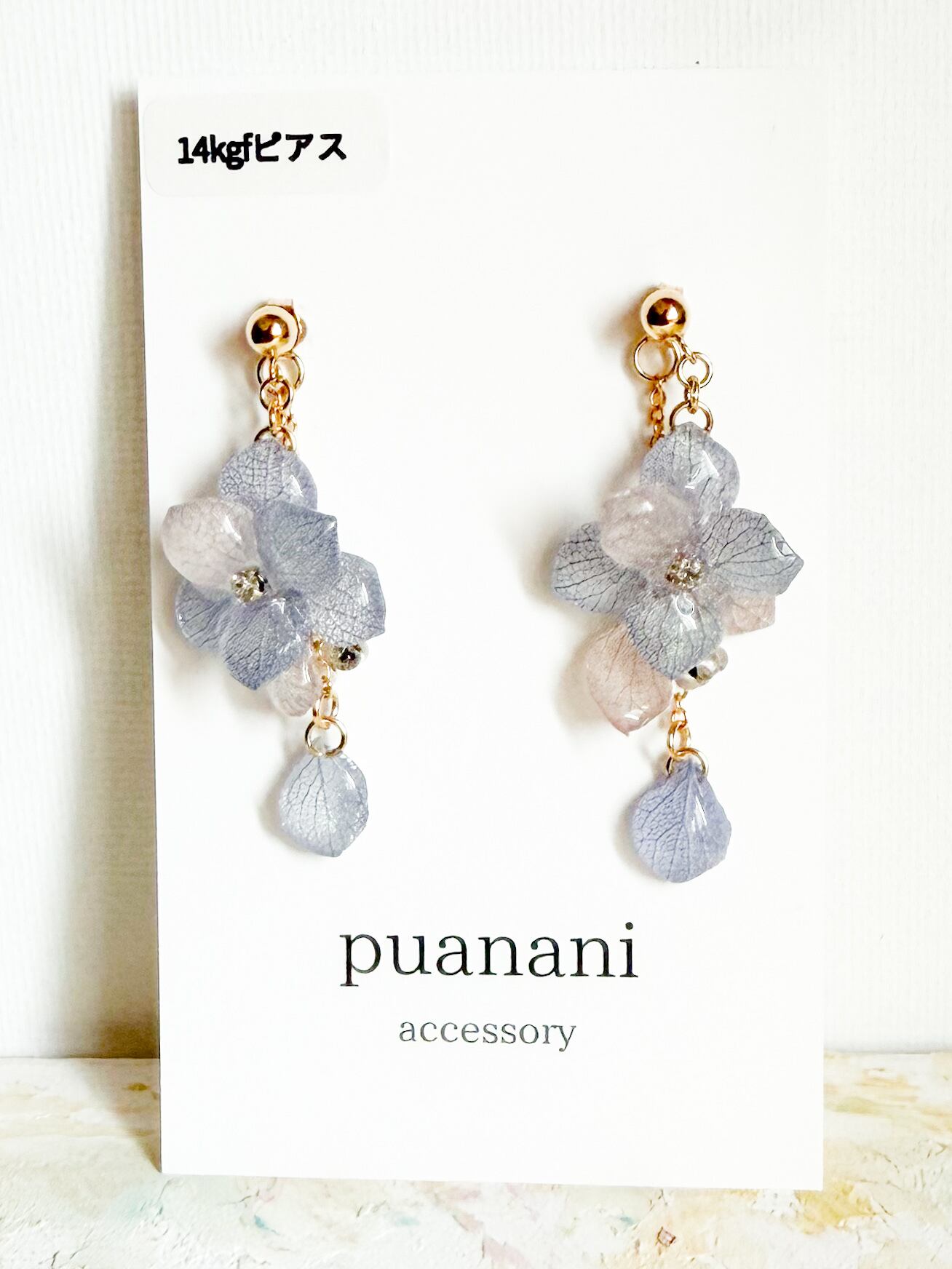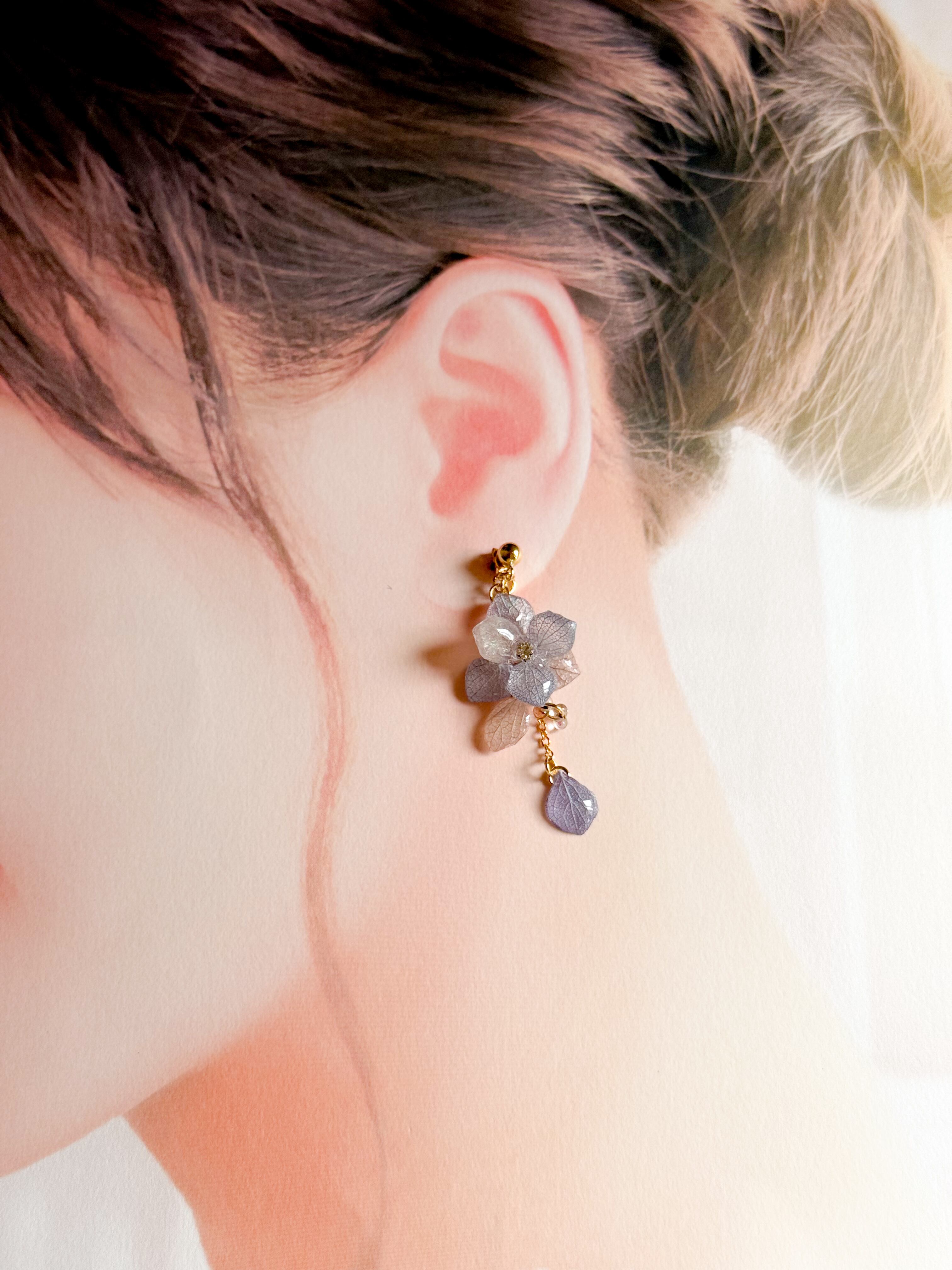 淡い色合いのあじさいの花びらを使った、優雅でかれんなピアスとイヤリングが登場しました。