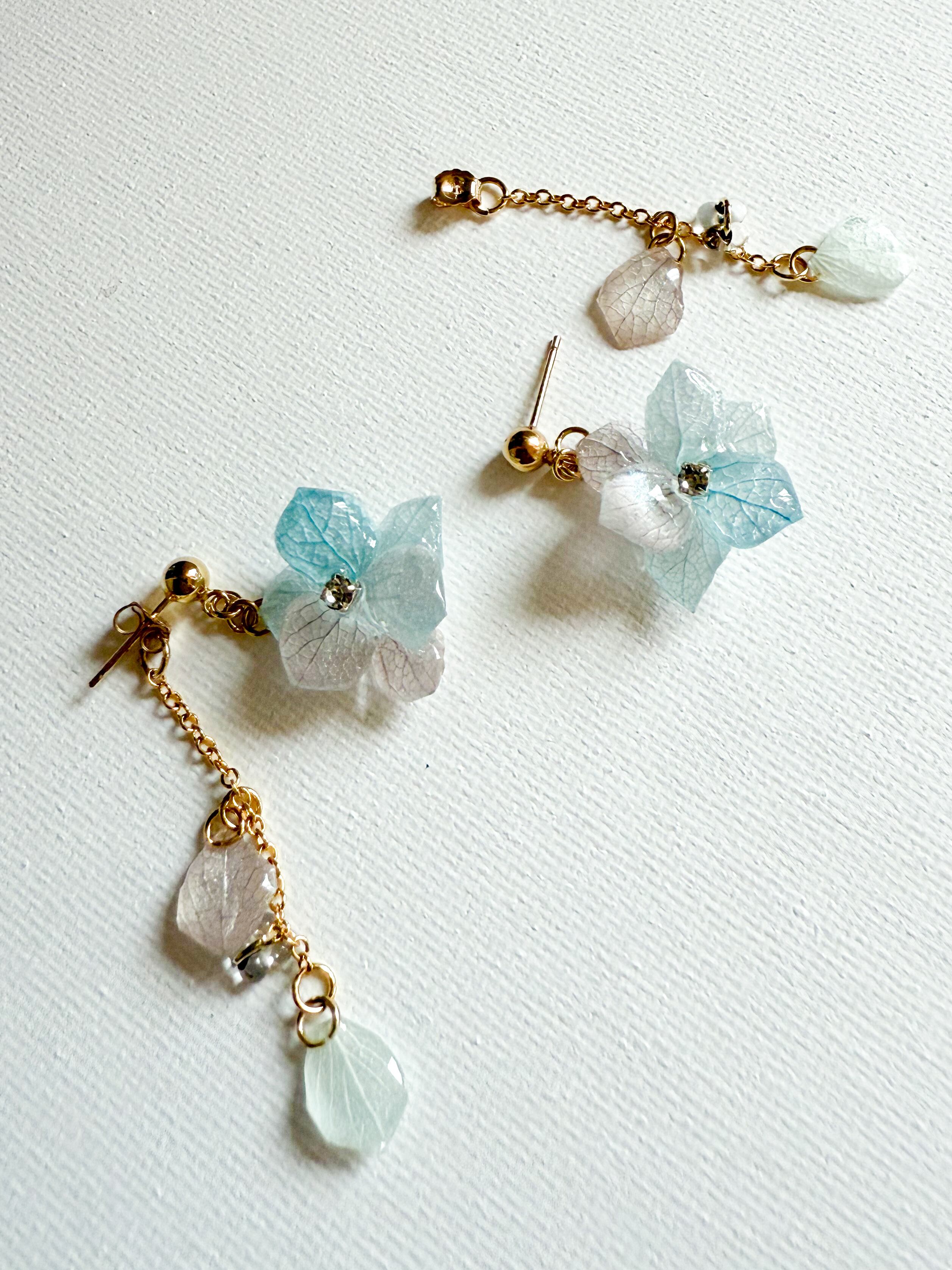 淡い色合いのあじさいの花びらを使った、優雅でかれんなピアスとイヤリングが登場しました。