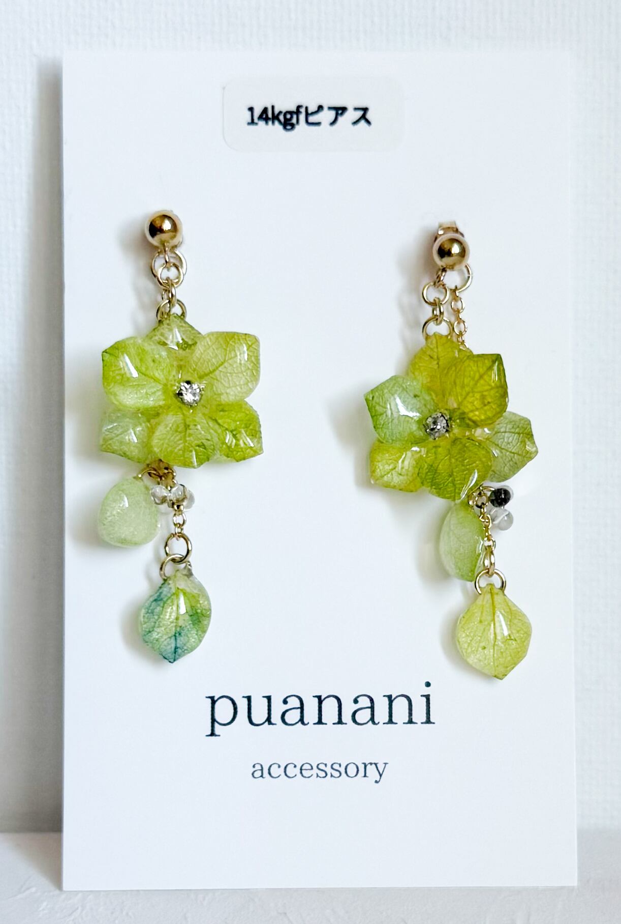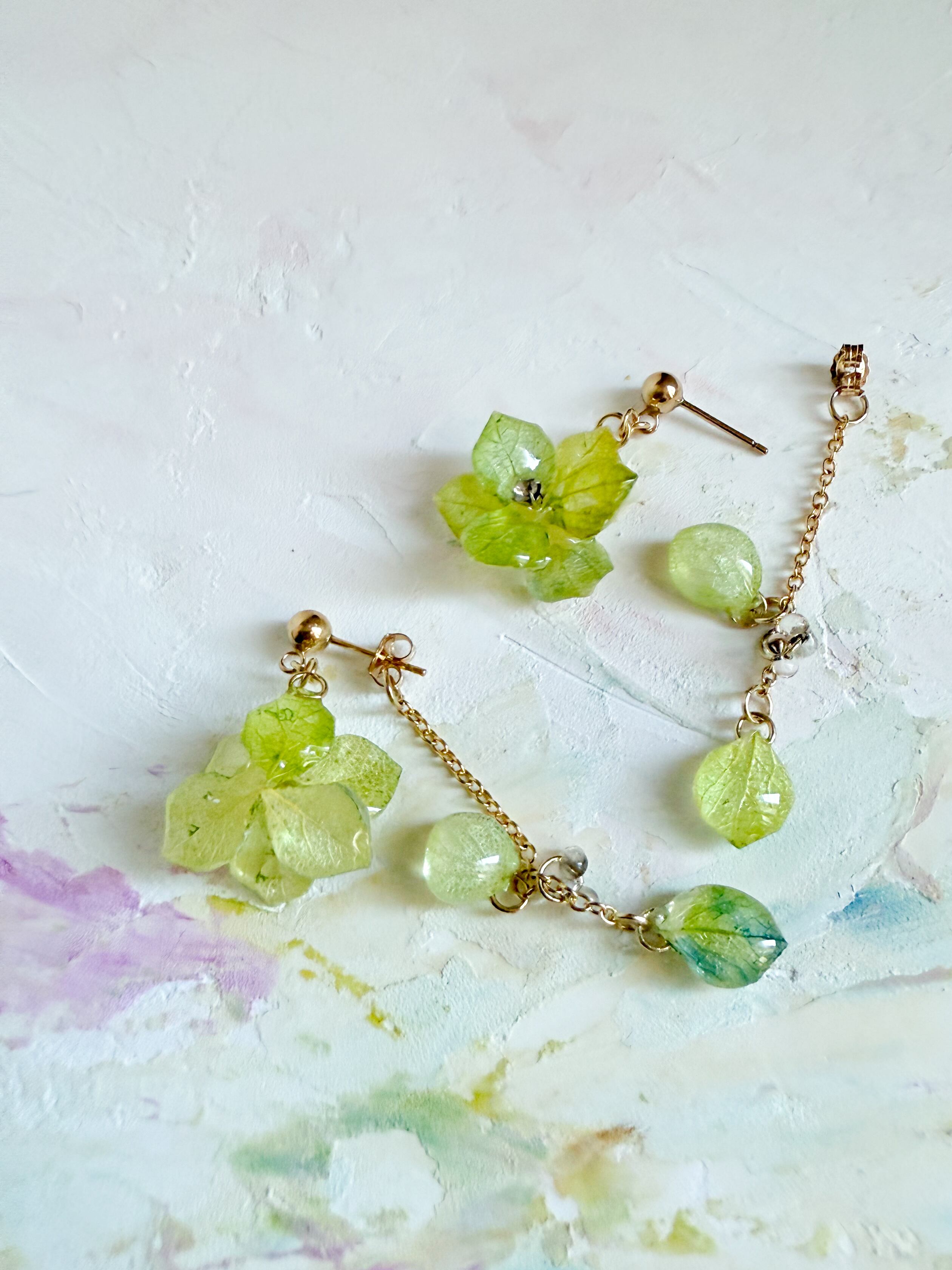淡い色合いのあじさいの花びらを使った、優雅でかれんなピアスとイヤリングが登場しました。
