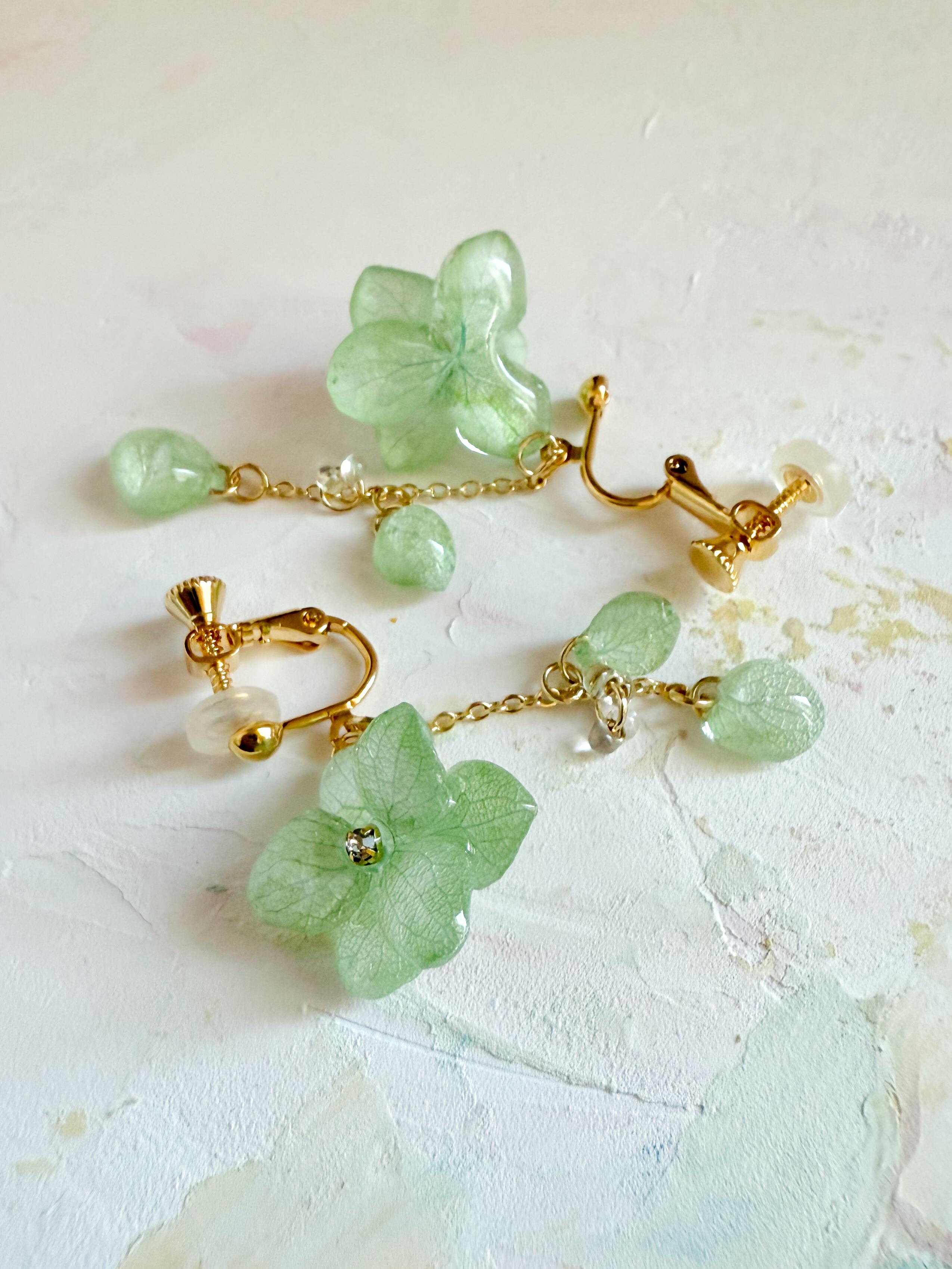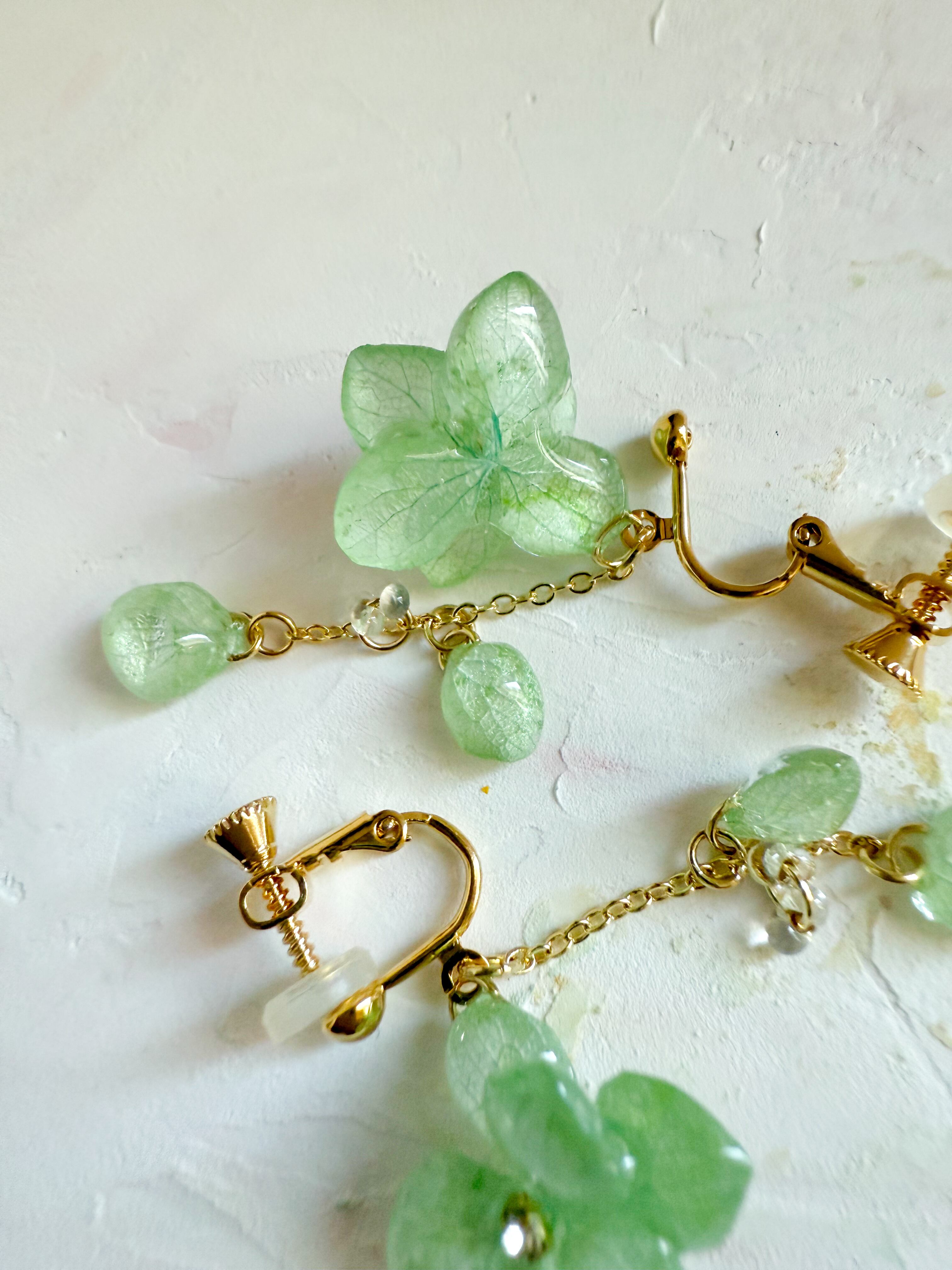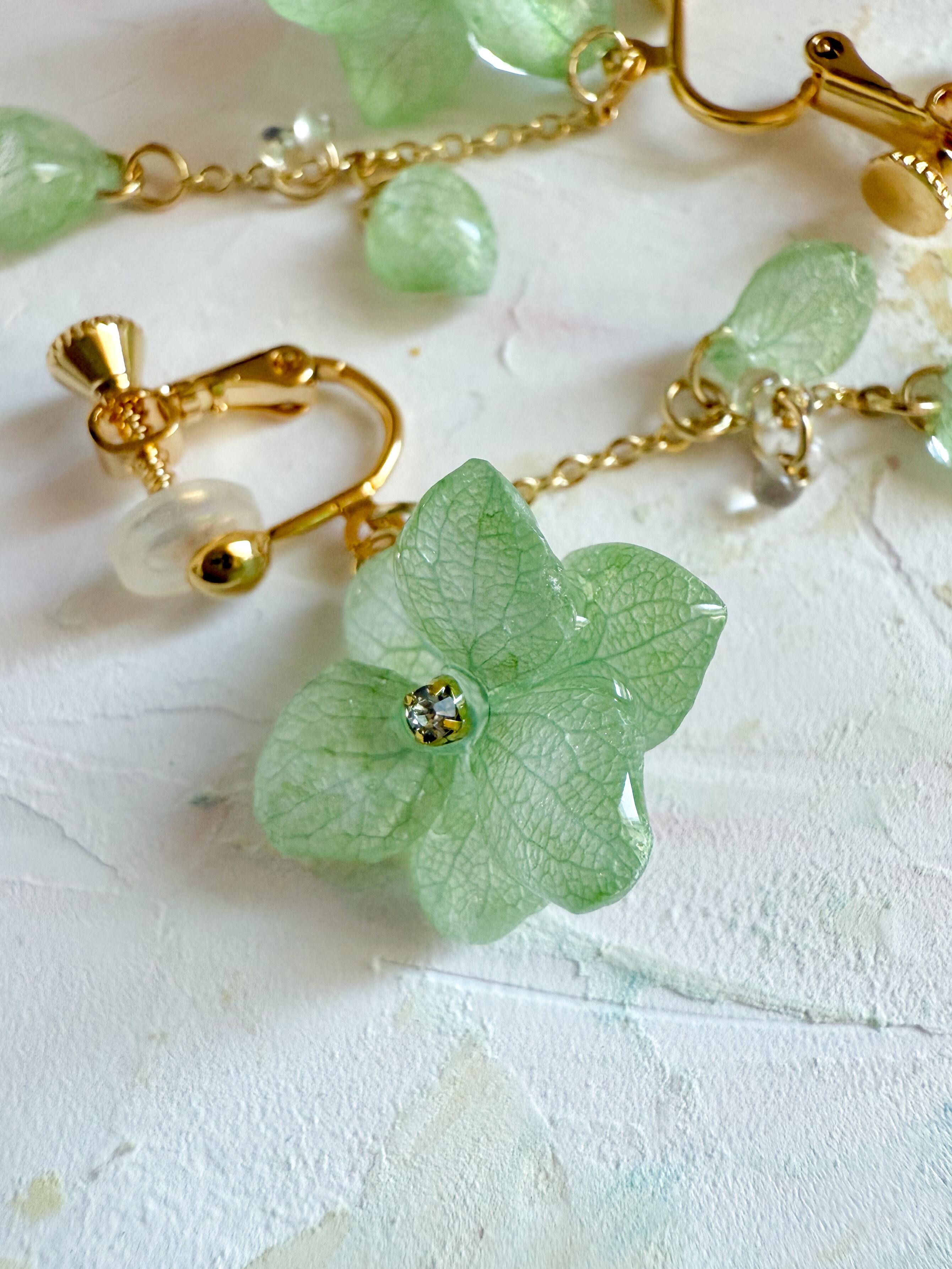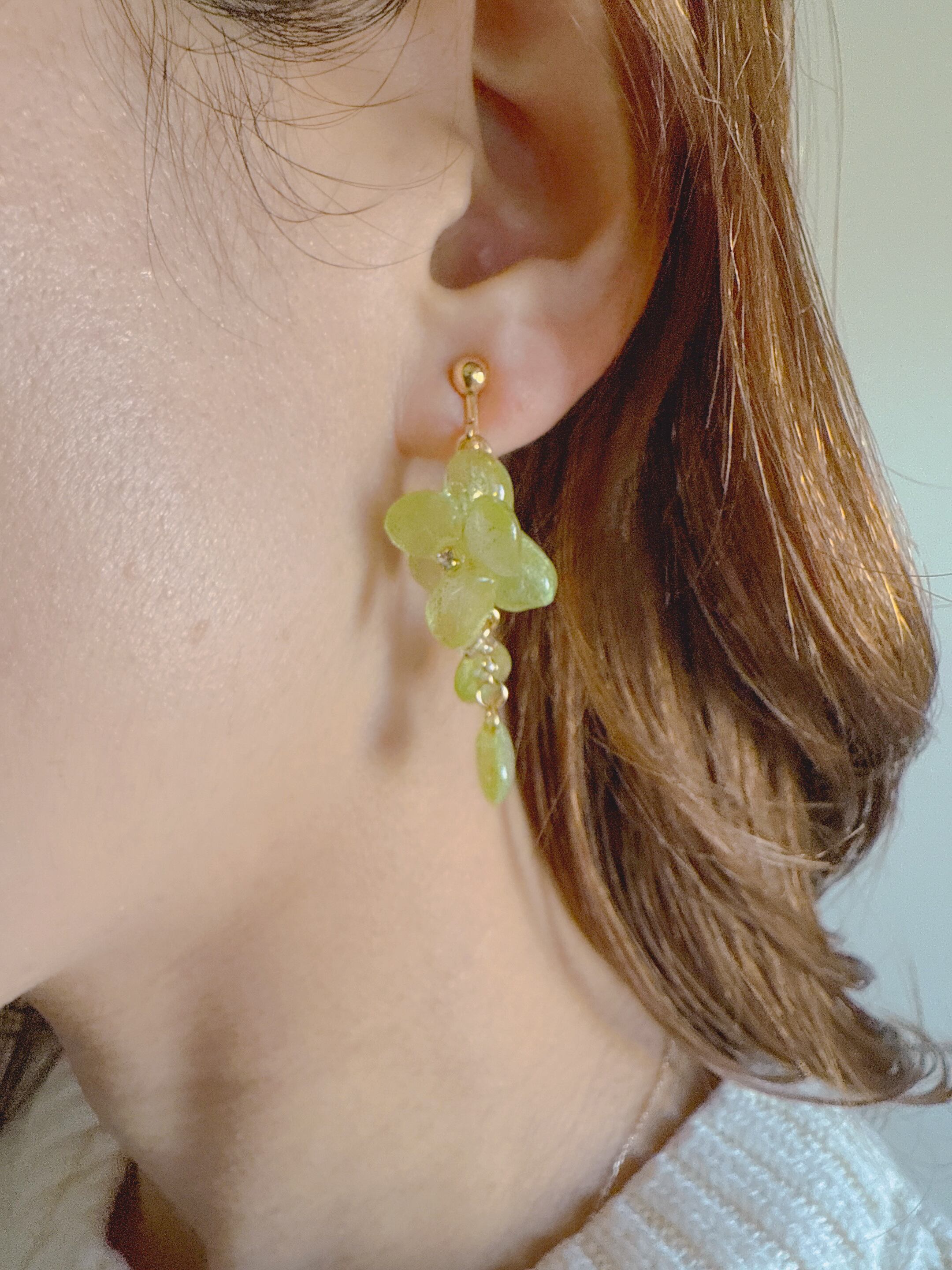 淡い色合いのあじさいの花びらを使った、優雅でかれんなピアス、イヤリングが登場しました。