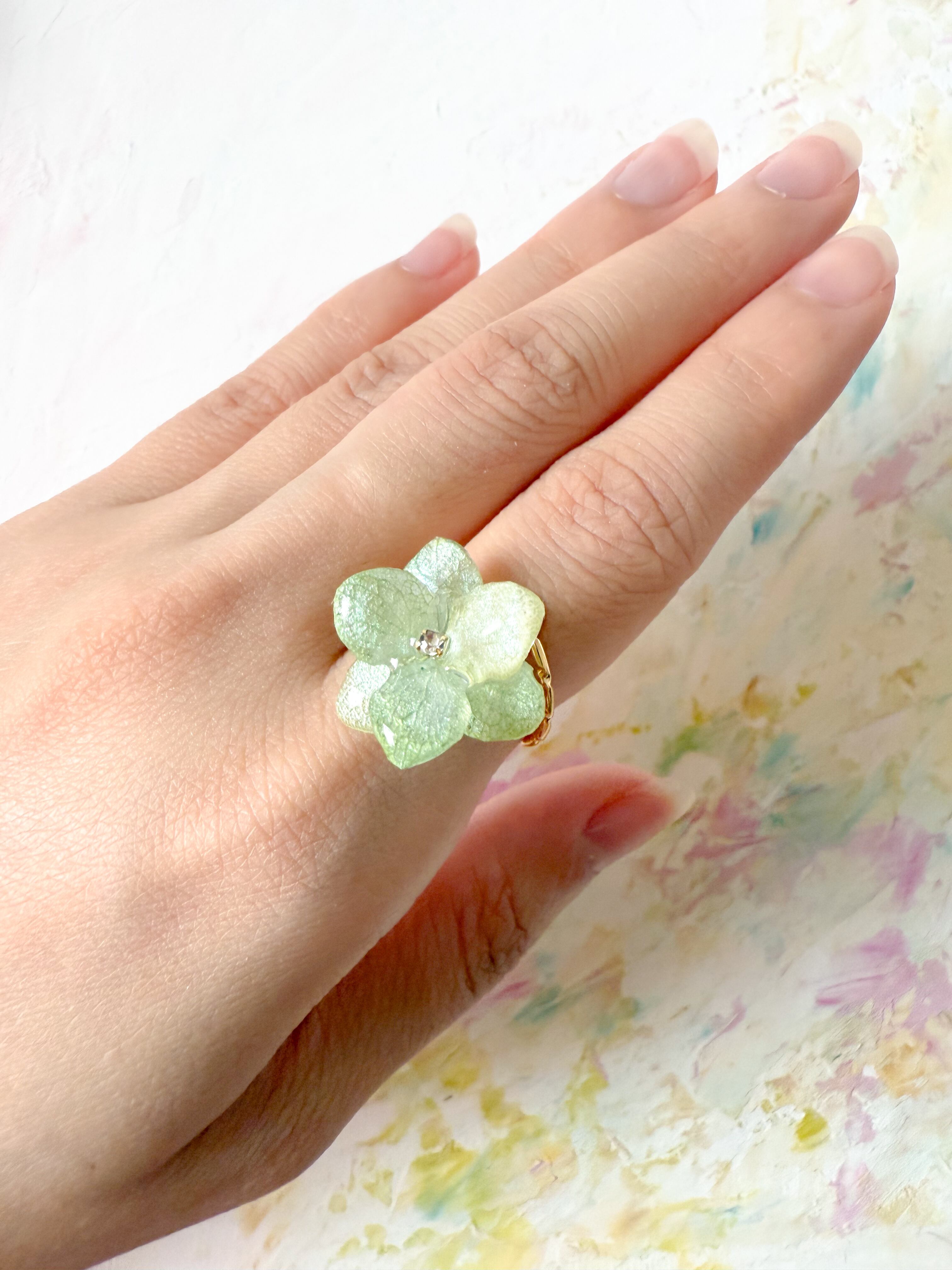 可憐なあじさいの花びらを使った、お花リングが登場しました。ミント、イエローグリーン、の花びらは、キラキラと輝いて、指先を華やかに彩ります。どんなシーンでもお使いいただける、デリケートでありながら存在感のあるデザインです。