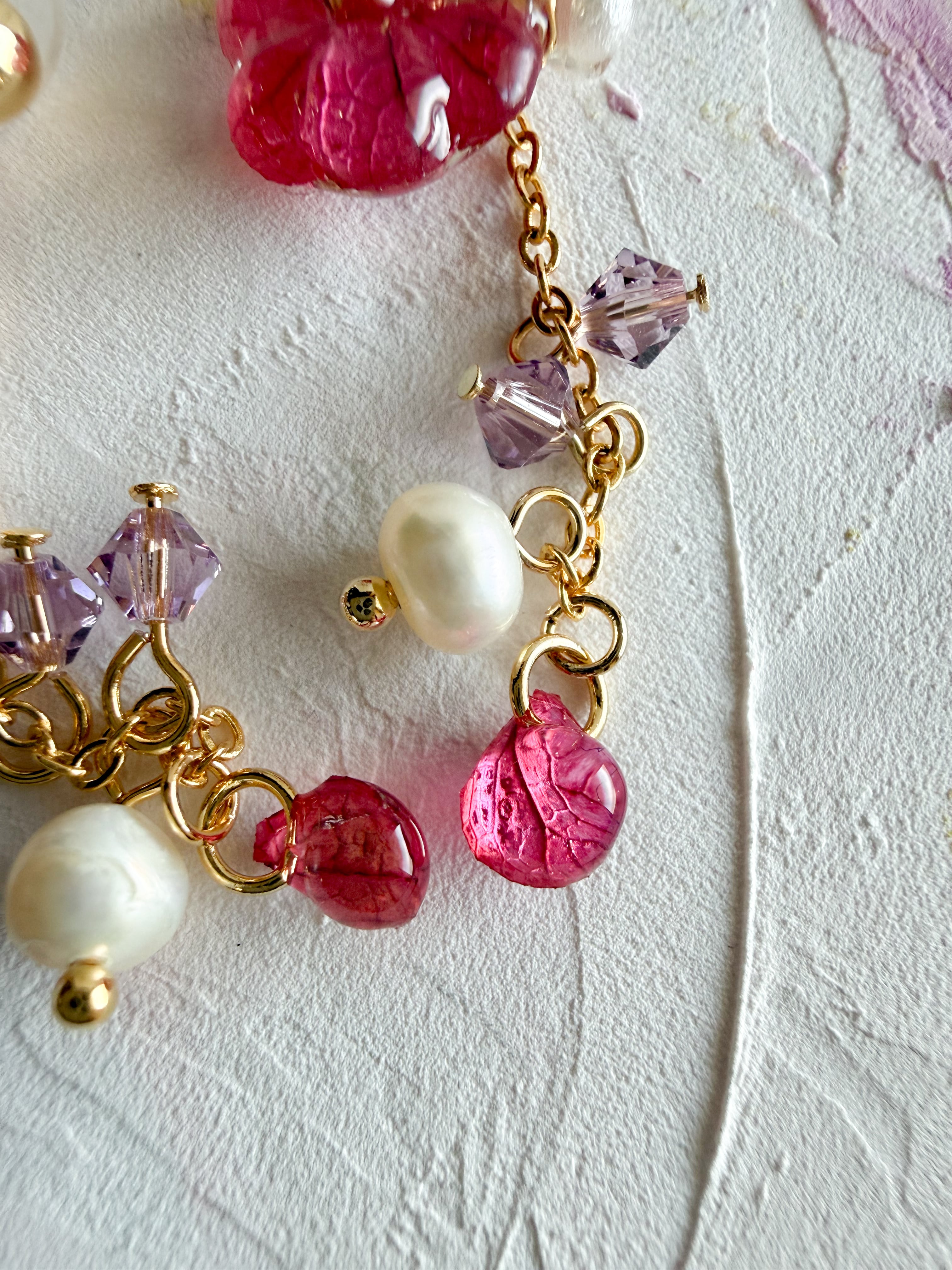 深みのあるボルドーの赤をテーマにした、小花のピアス(イヤリング選択可能)が新たに登場しました。あじさいの花びらを丁寧にカットし、レジンでぷっくりと仕上げられたこのアイテムは、存在感と繊細さを兼ね備えています。コットンパールや揺れるクリスタルビーズ、そして花びらから作られたビーズが、あなたの耳元に特別な魅力を引き立て、優雅な印象を与えます。