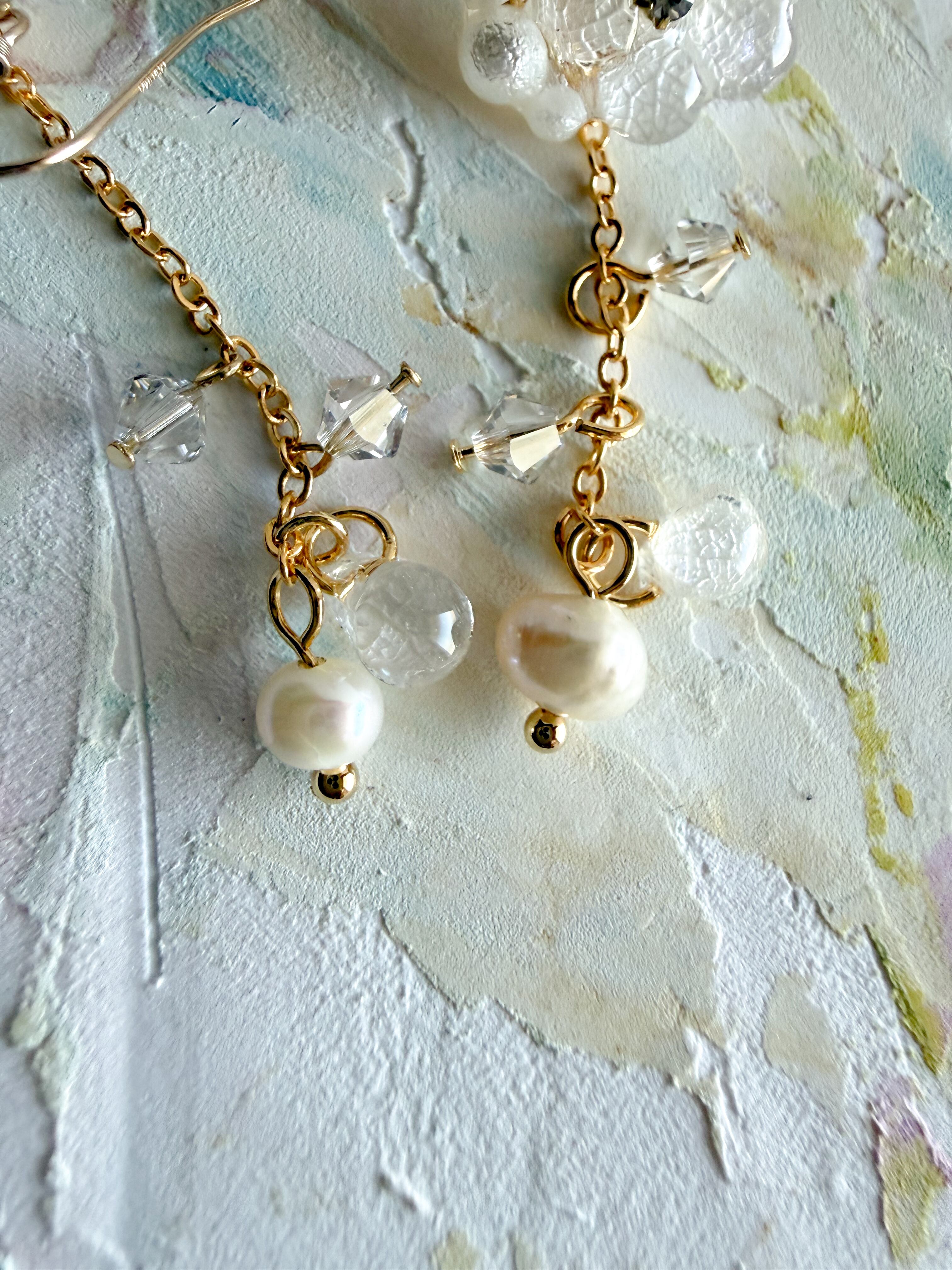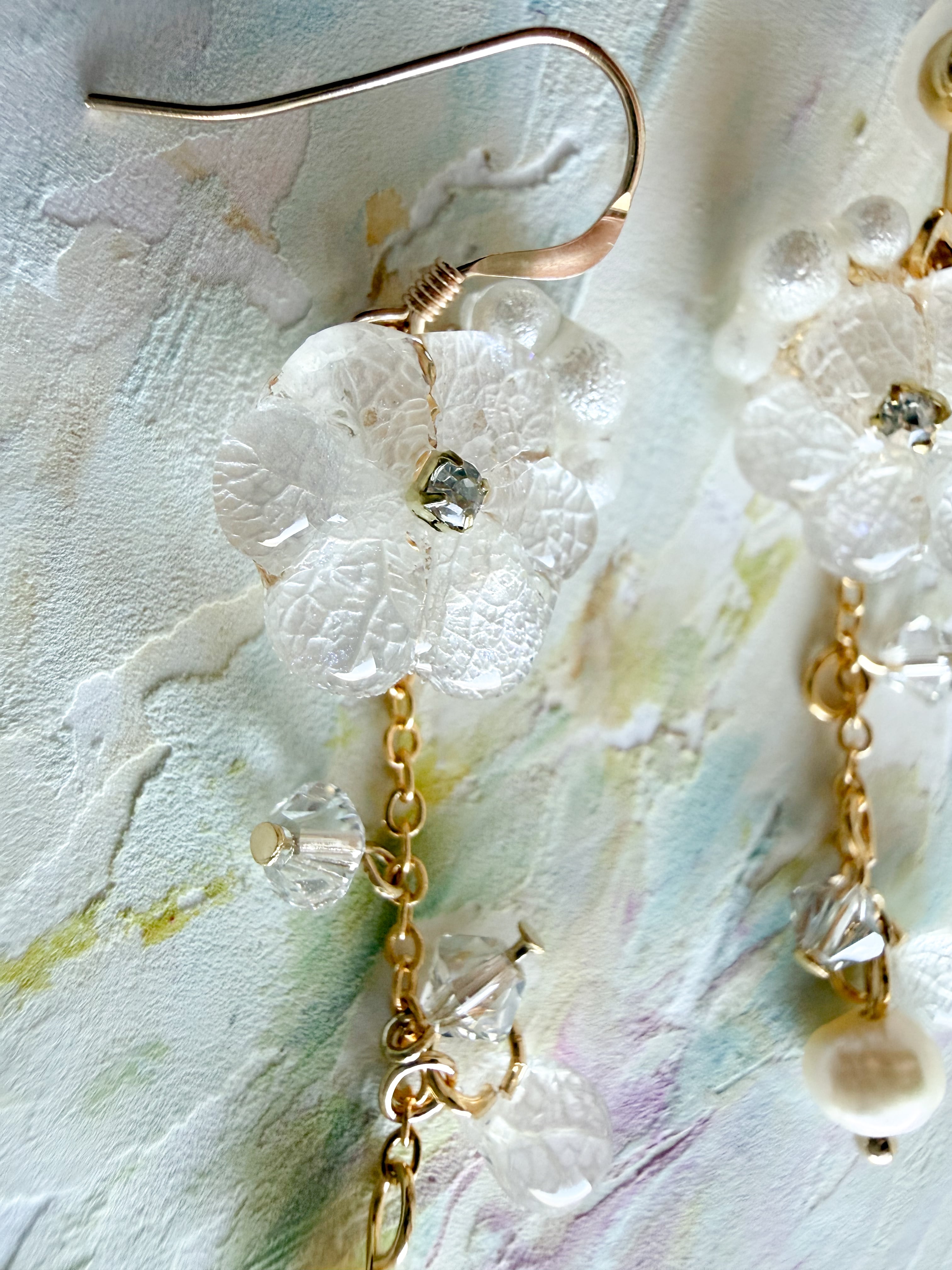 清らかな新雪の白をテーマにした、小花のピアス(イヤリング選択可能)が新たに登場しました。あじさいの花びらを丁寧にカットし、レジンでぷっくりと仕上げられたこのアイテムは、繊細さと優雅さを兼ね備えています。揺れるクリスタルビーズや花びらから作られたビーズ、そして淡水パールが、あなたの耳元に特別な魅力を与え、存在感を引き立てます。