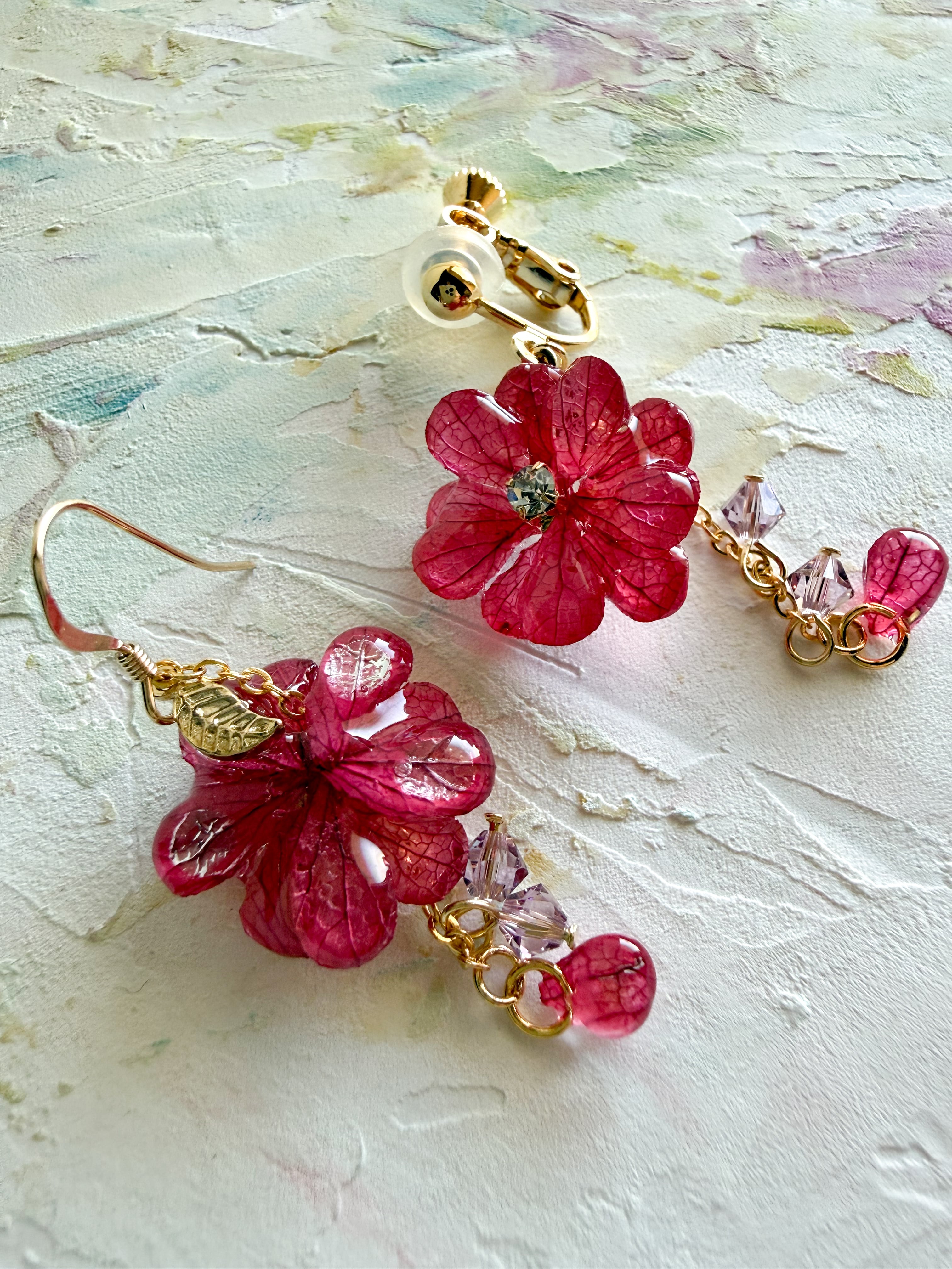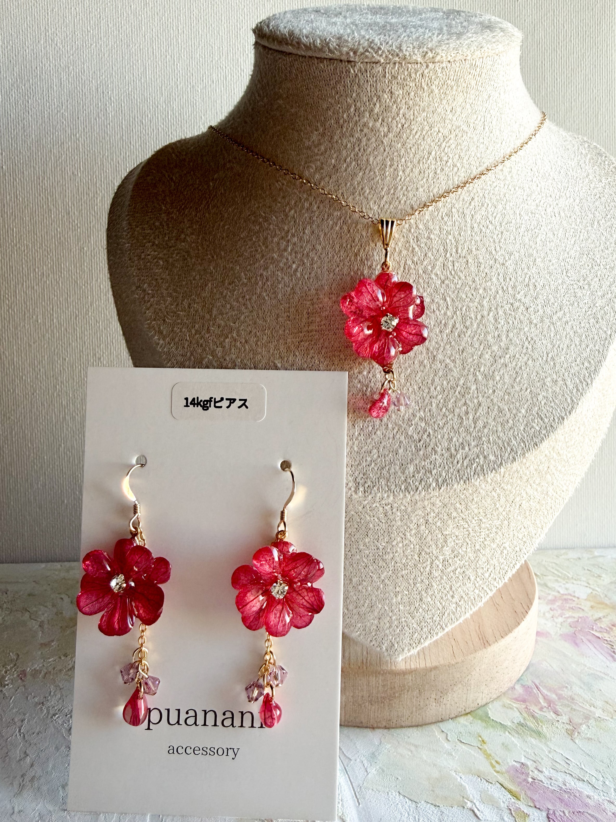 深みのあるボルドーの赤をテーマにした、大花のネックレスセット(ピアス・イヤリング選択可能)が新たに登場しました。あじさいの花びらを丁寧にカットし、レジンでぷっくりと仕上げられたこのアイテムは、華やかさと存在感を兼ね備えています。揺れる大花のデザインが、あなたのスタイルに特別な魅力を与え、心を引き寄せる装飾を演出します。