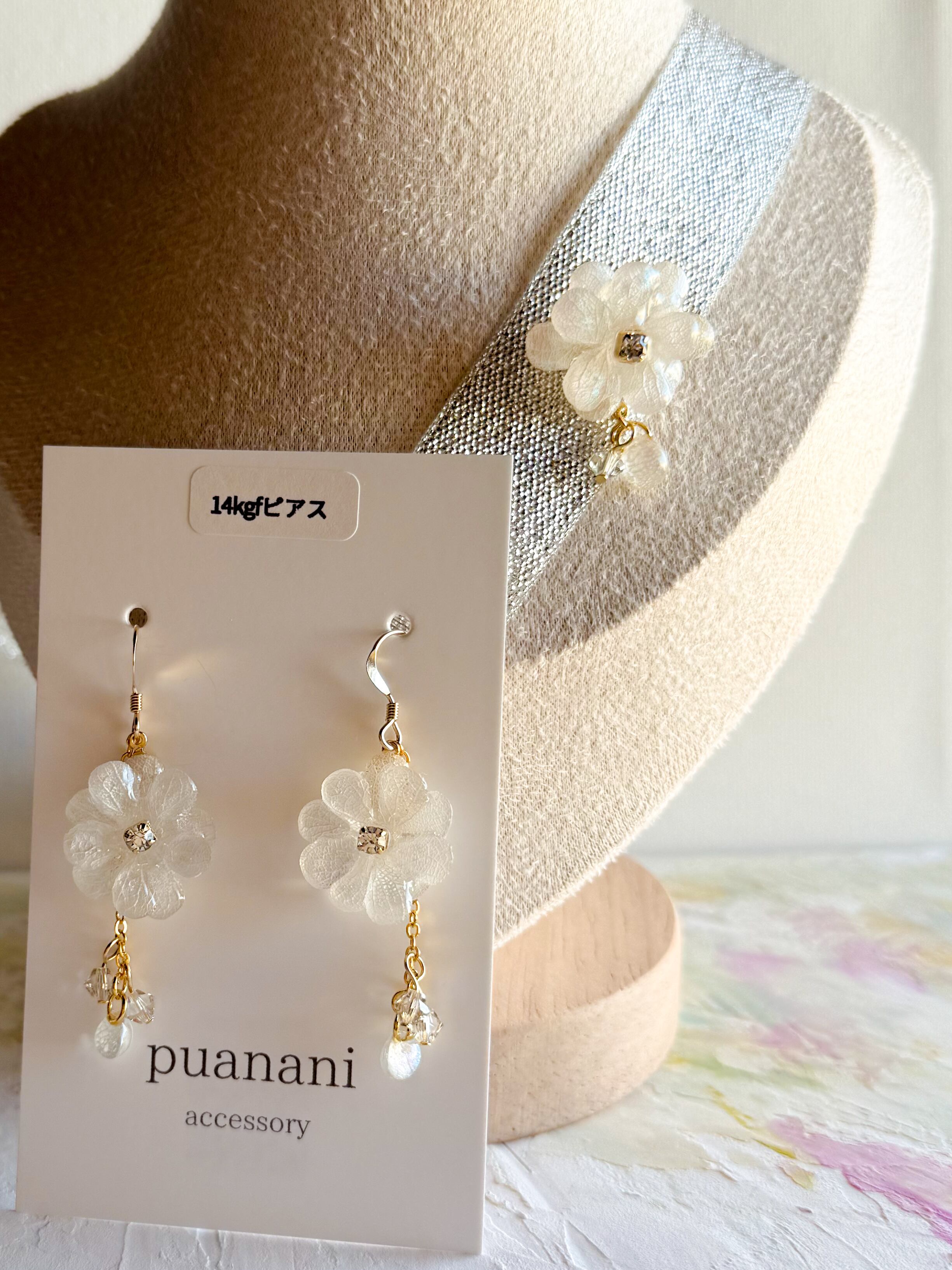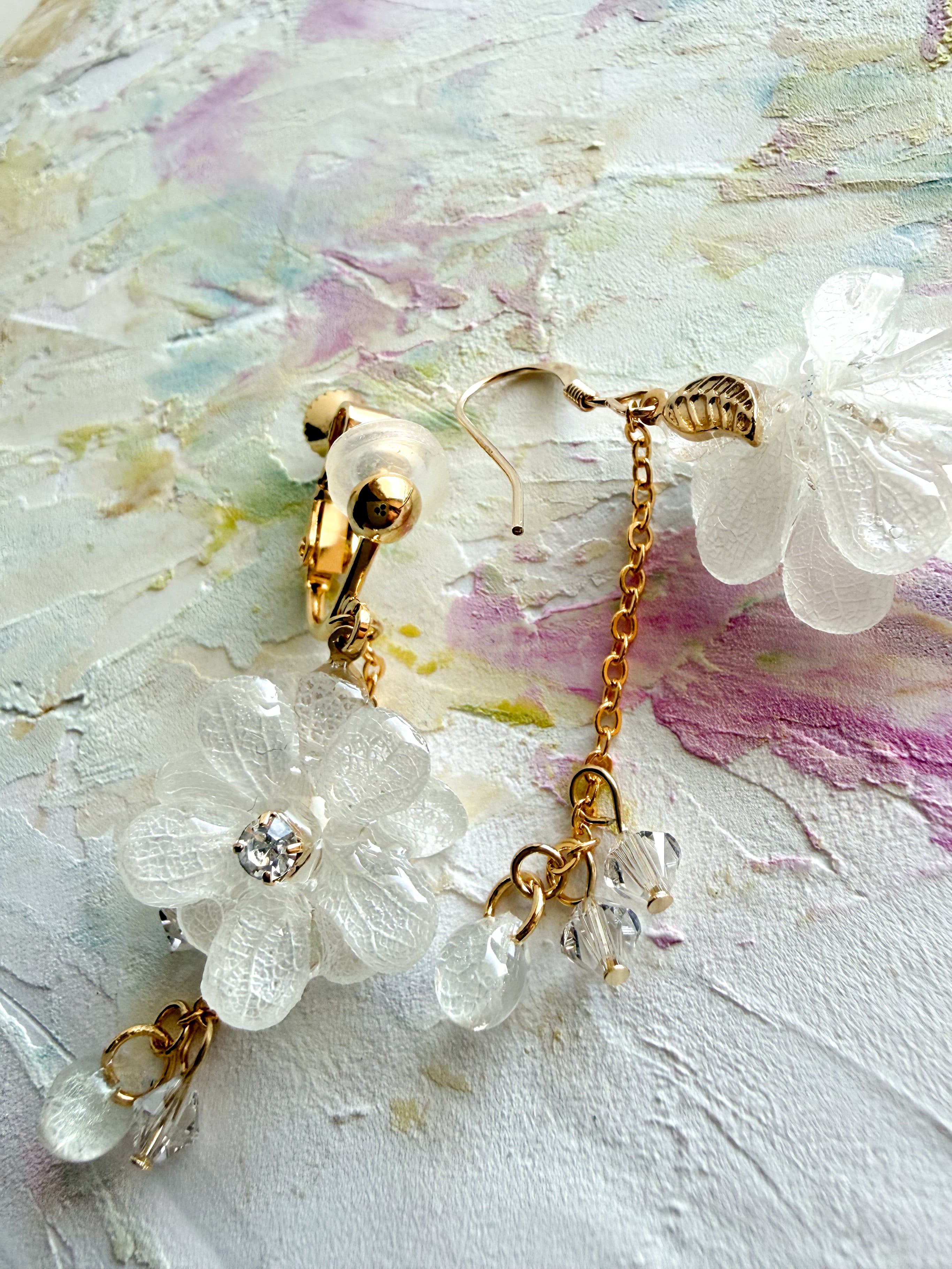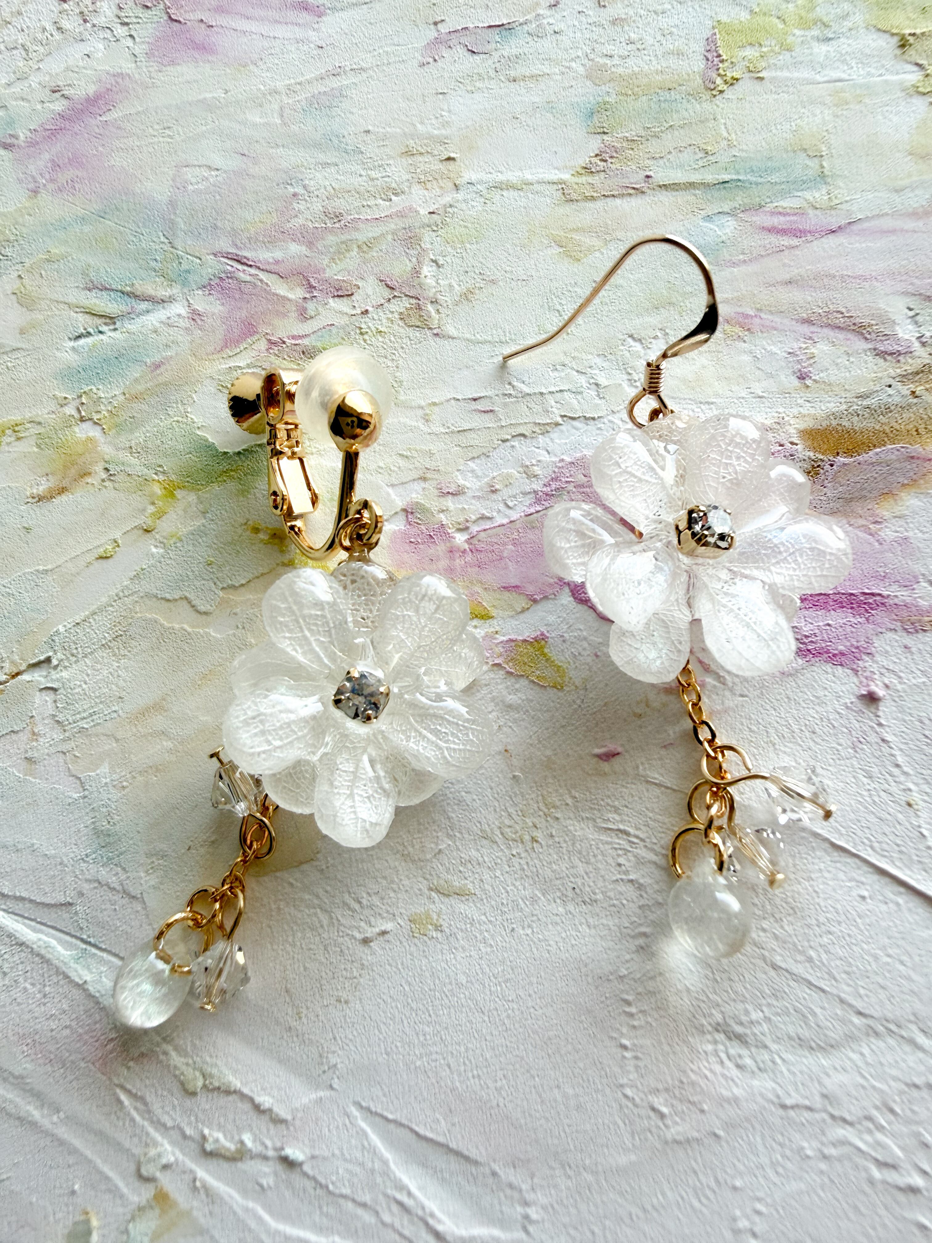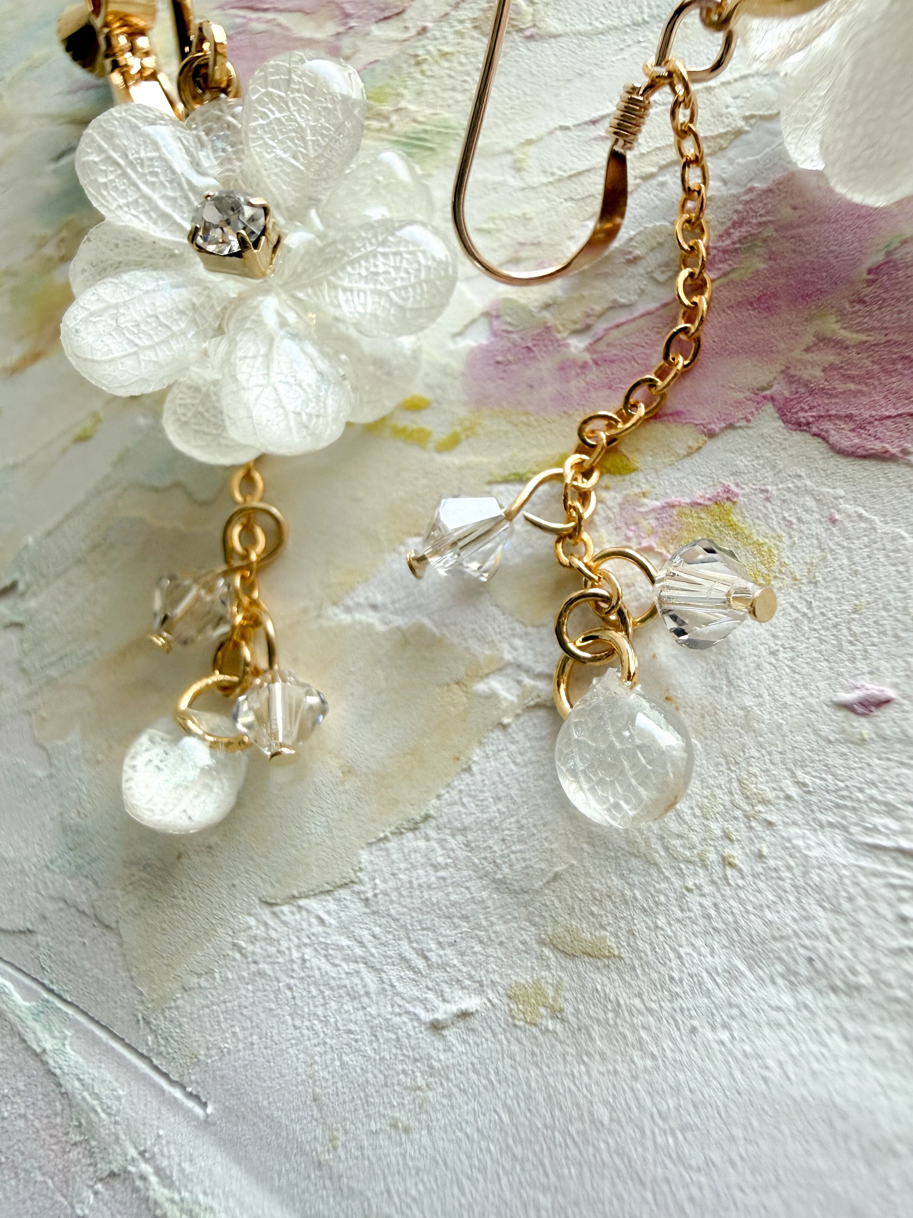 繊細な商品ですので、無理に曲げたり、引っ張ったりしないようご注意ください。特に明記のない商品の金具には金属メッキが使用されていますので、金属アレルギーのある方はご注意いただくことをおすすめします。水濡れや長時間の着用によって、色あせや変色の可能性がありますのでお気をつけください。樹脂を使用した製品の場合、高温多湿な環境での保管を避け、変形や変色を防ぐようにしてください。ハンドメイドパーツや天然素材を使用した製品には、形、色、大きさ、柄に個体差があることをご理解いただければ幸いです。*ひとつひとつのあじさいの良さを感じていただければと思います。*モニターやブラウザの環境によって、色味が異なる場合がございますのであらかじめご了承ください。