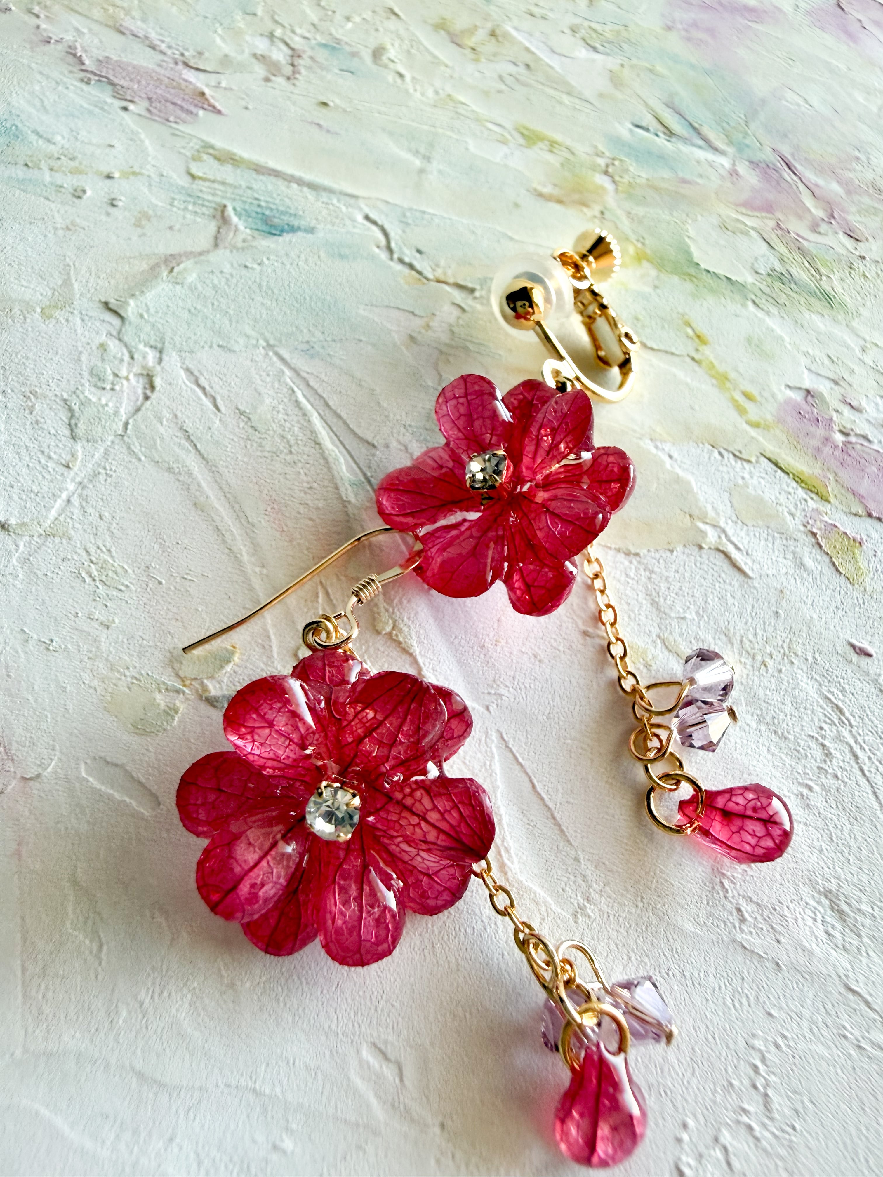 深みのあるボルドーの赤をテーマにした、大花のネックレスセット(ピアス・イヤリング選択可能)が新たに登場しました。あじさいの花びらを丁寧にカットし、レジンでぷっくりと仕上げられたこのアイテムは、華やかさと存在感を兼ね備えています。揺れる大花のデザインが、あなたのスタイルに特別な魅力を与え、心を引き寄せる装飾を演出します。