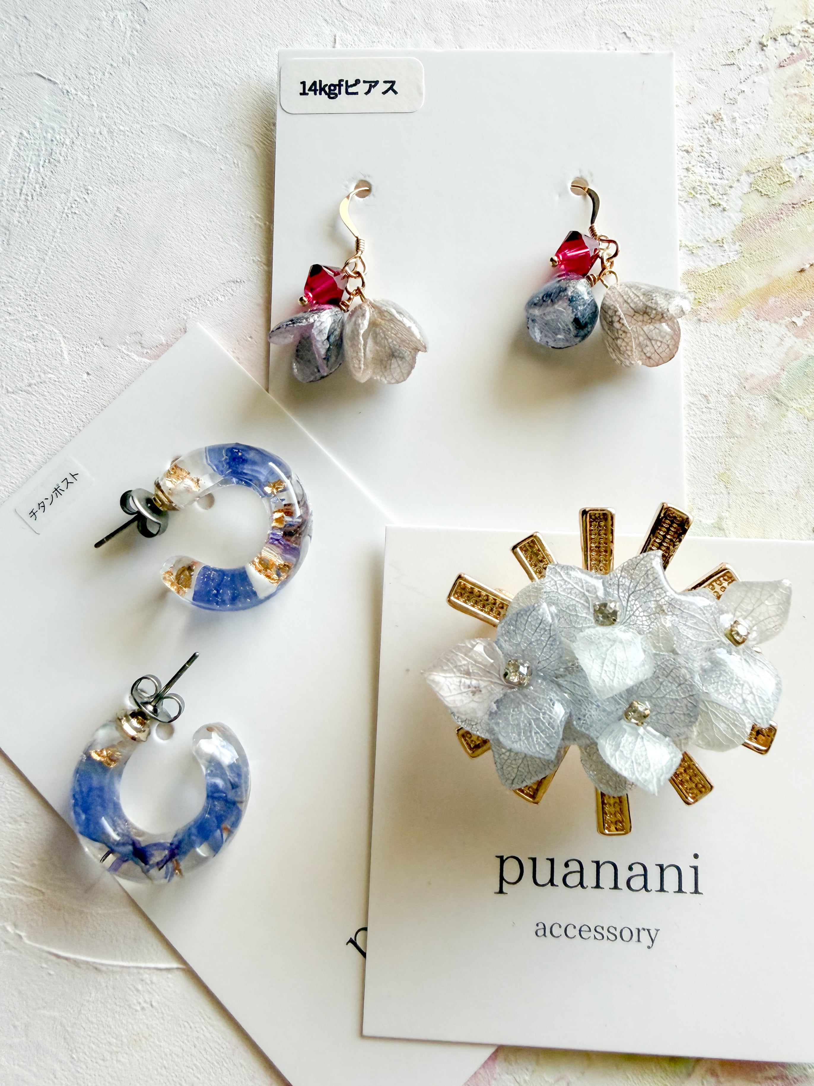 あじさいの花びらを表現したグレーピアスは、シックな色合いで耳元に上品さを添えます。また、チタンポストを使用したブルーフープピアスは、肌に優しく快適な着用感を提供します。さらに、あじさいのブローチは、シンプルながらも目を引くデザインで、特別な日や日常のコーディネートに華を添えてくれます。
