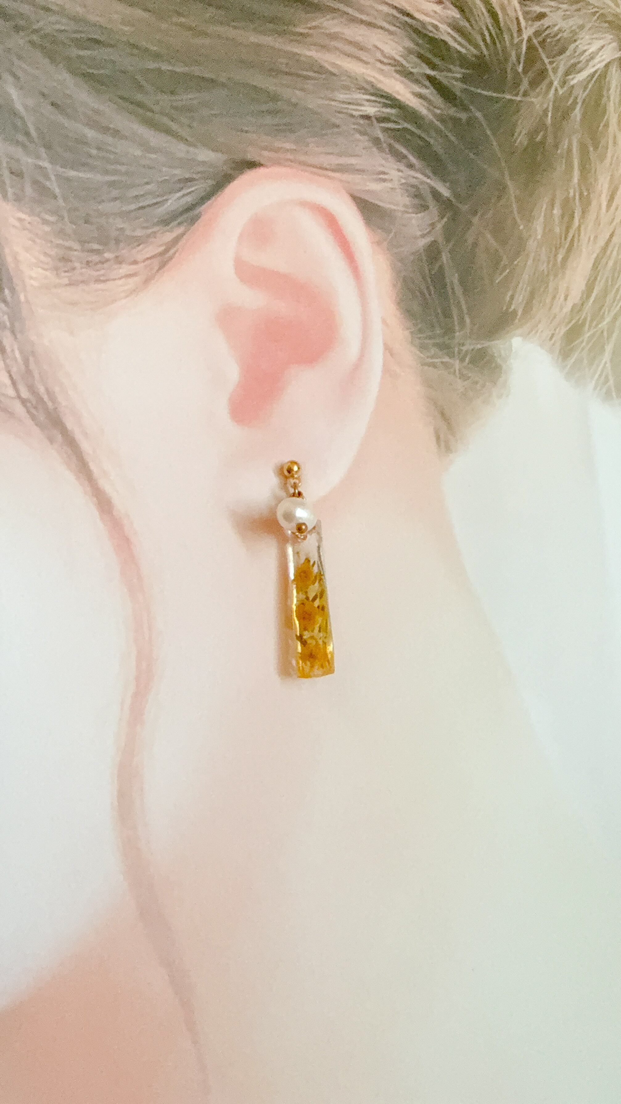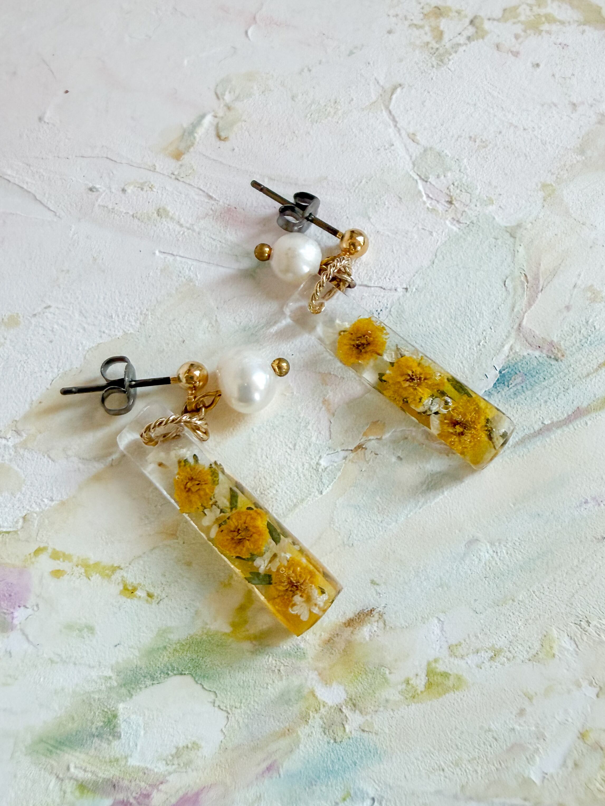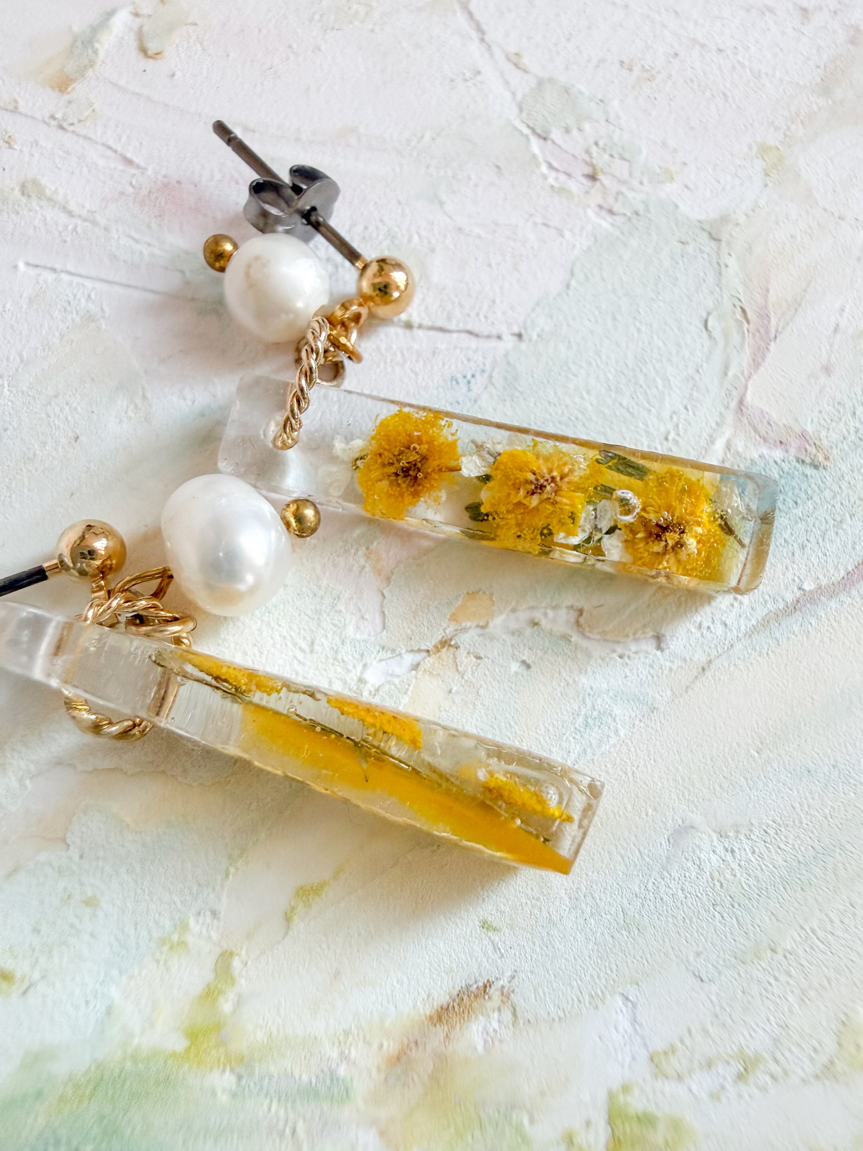 あじさいベルオレンジピアス・ミモザ、淡水パールピアス・あじさいブローチ3点セット
