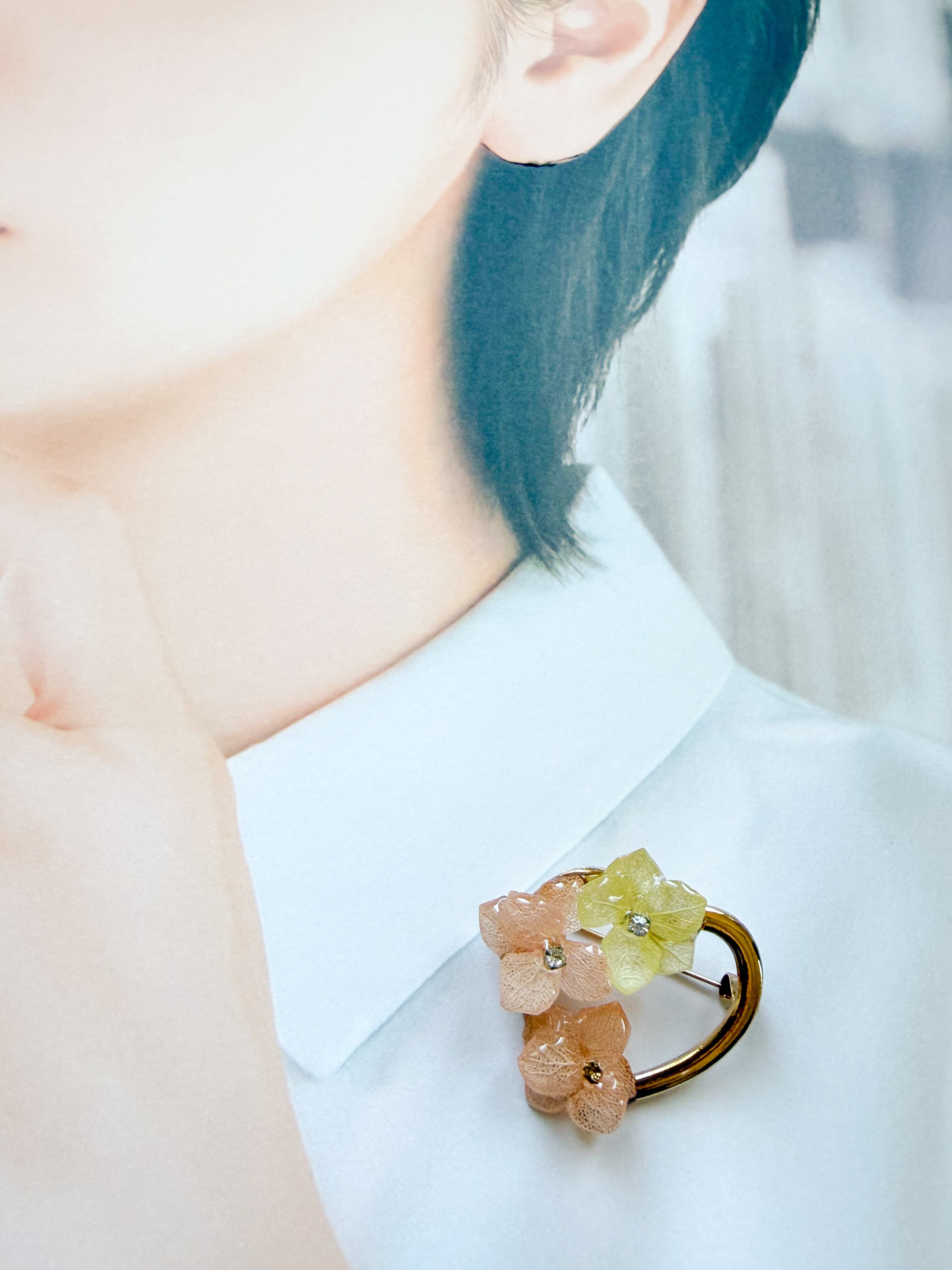 あじさいのオレンジベルピアスは、14kgfの素材を使用しており、明るい色合いが耳元を華やかに飾ります。さらに、ミモザのピアスにはチタンポストを採用しているため、敏感なお肌にもやさしく、安心してご使用いただけます。また、あじさいブローチはシンプルでありながら存在感を放ち、特別な日から日常まで幅広く活躍します。