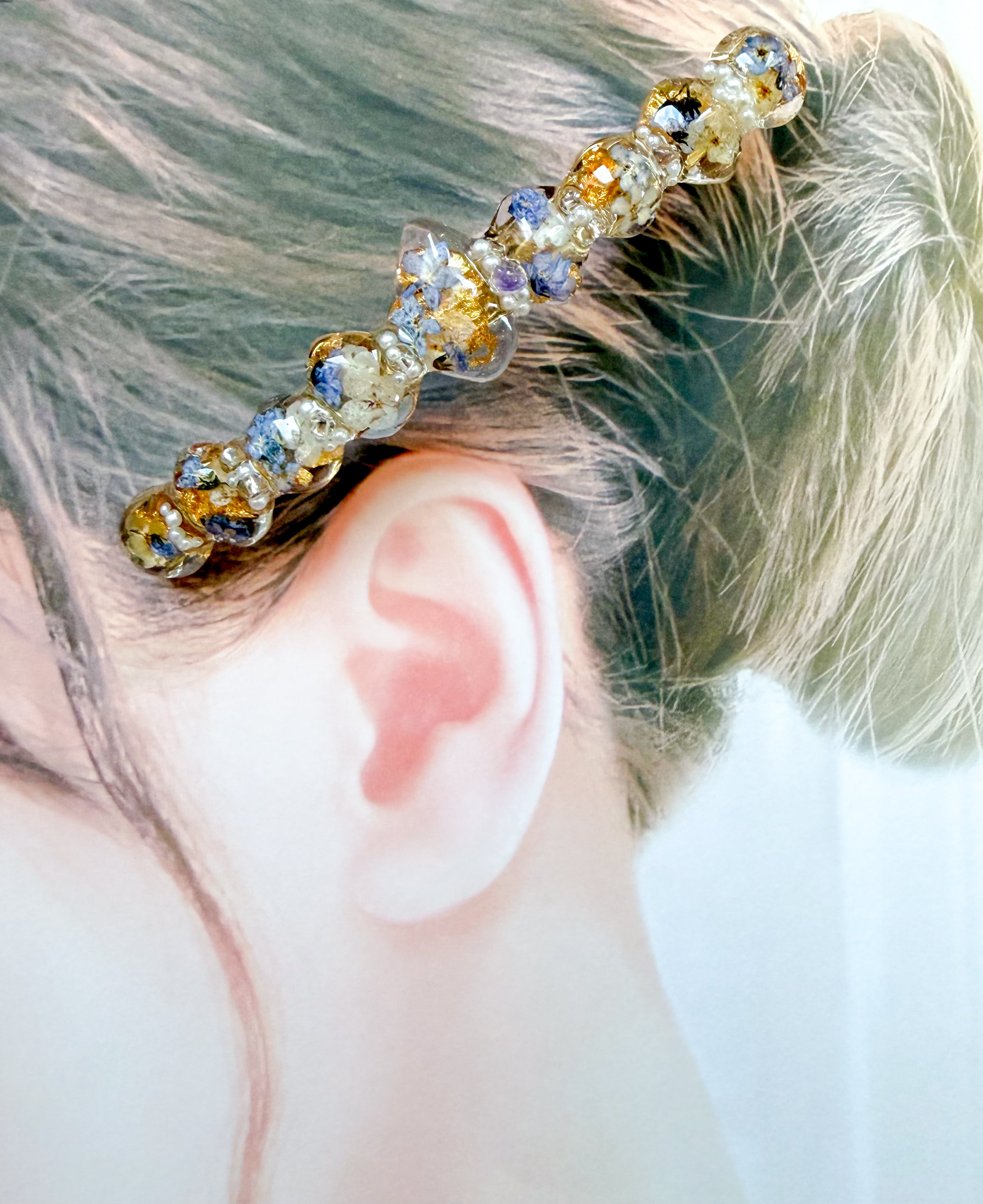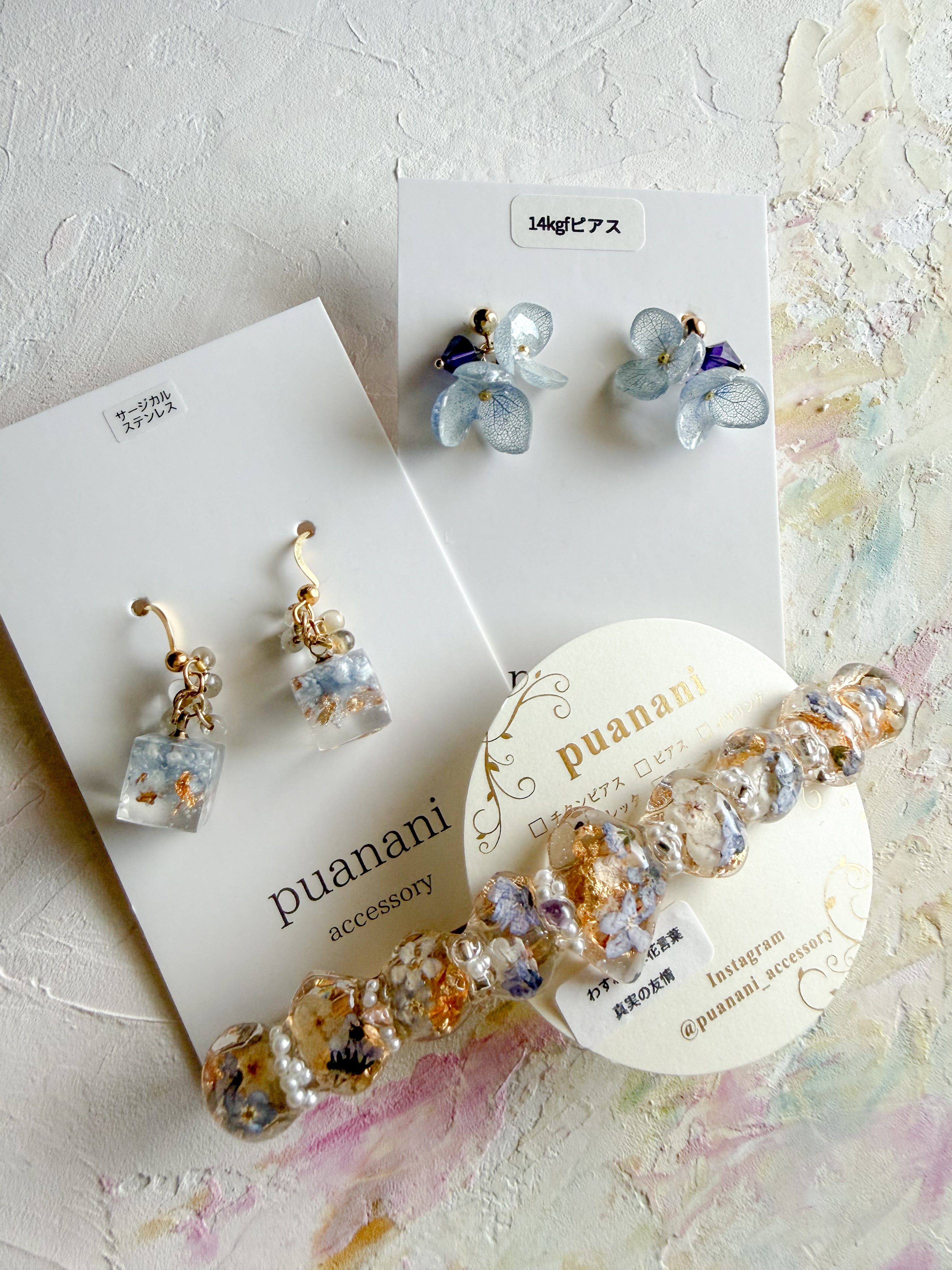 特別な瞬間を彩る素敵なアクセントとして、このあじさいベルブルーピアス・クリスパムキューブピアス・わすれなぐさバレッタをぜひお手元にお迎えください。