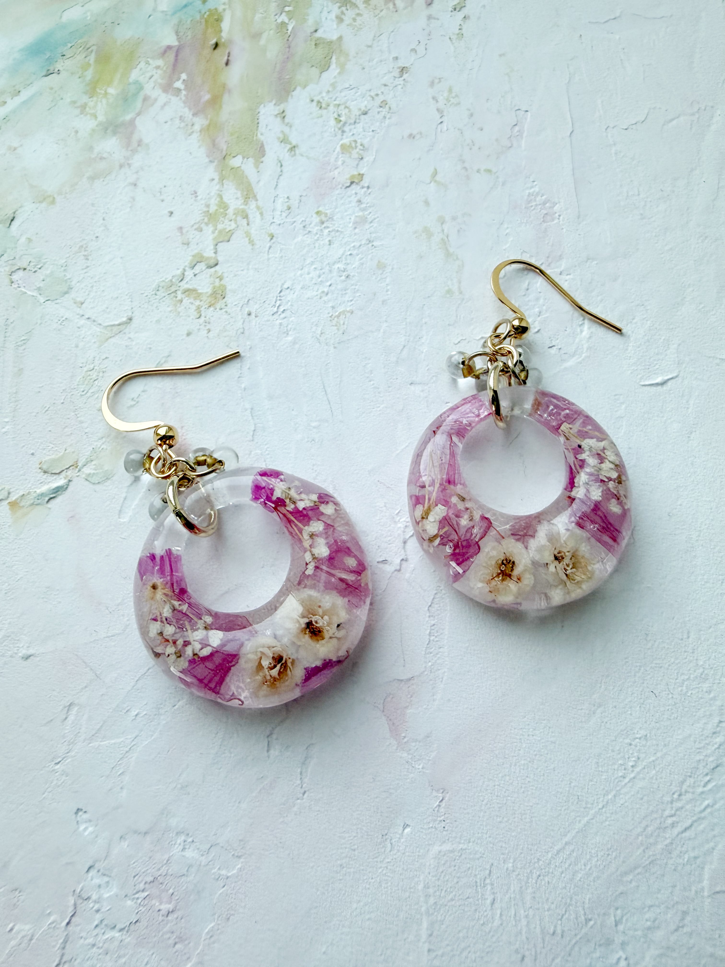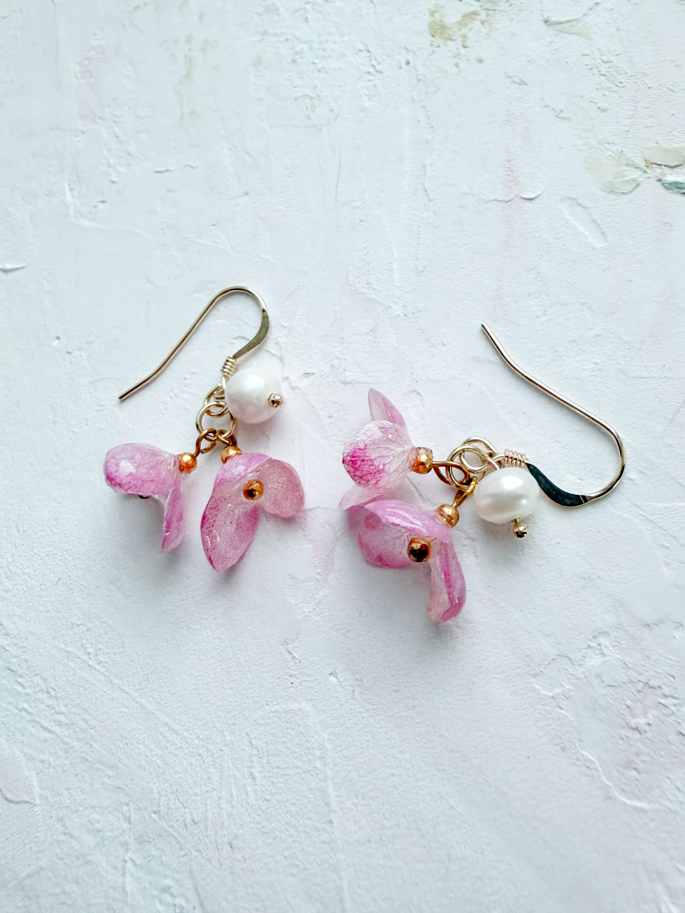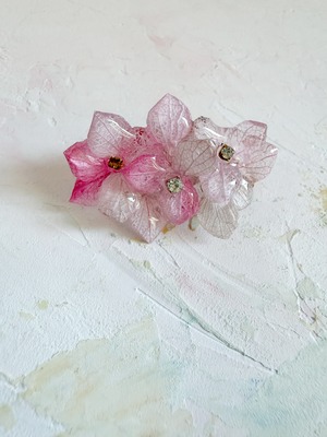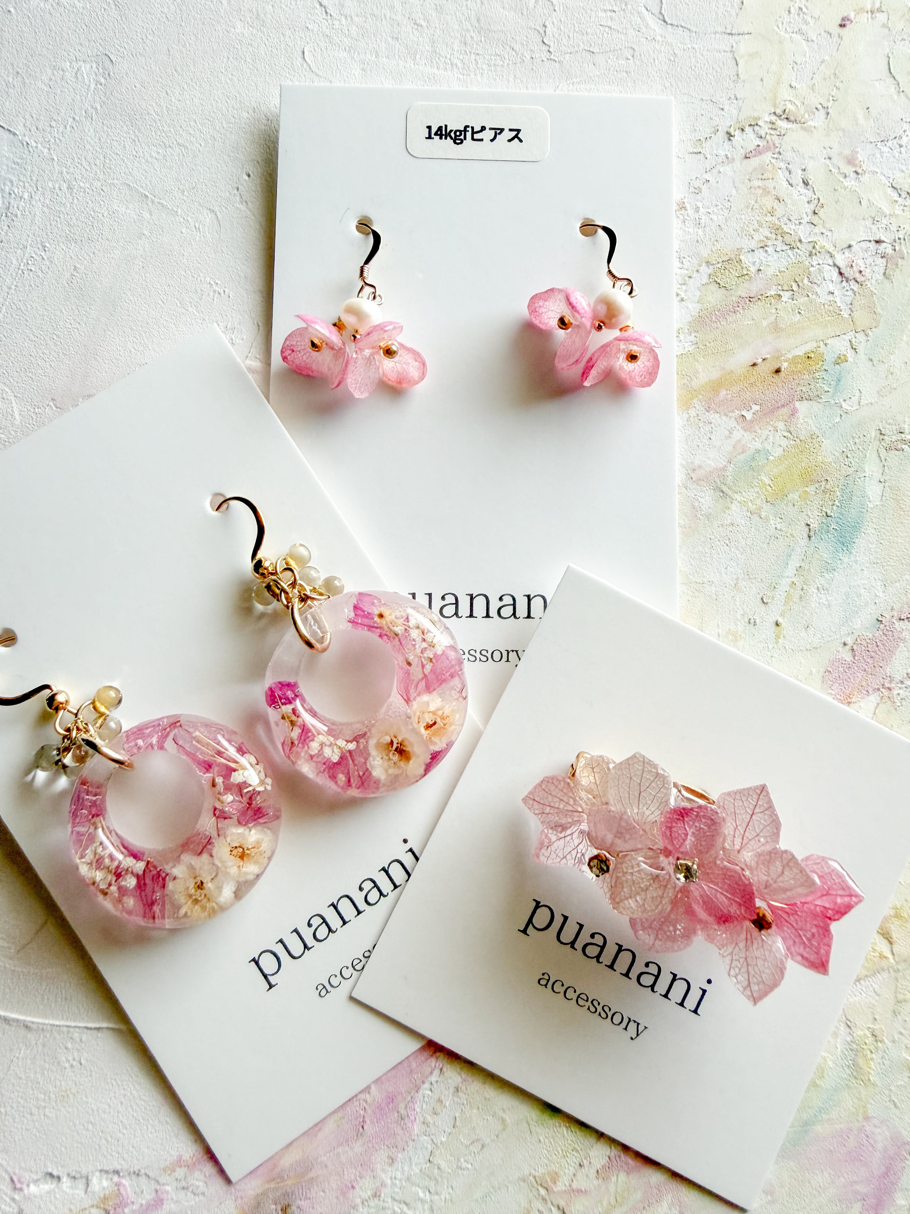 あじさいベルピンクピアス・かすみ草オーバルピアス・あじさいブローチ3点セット