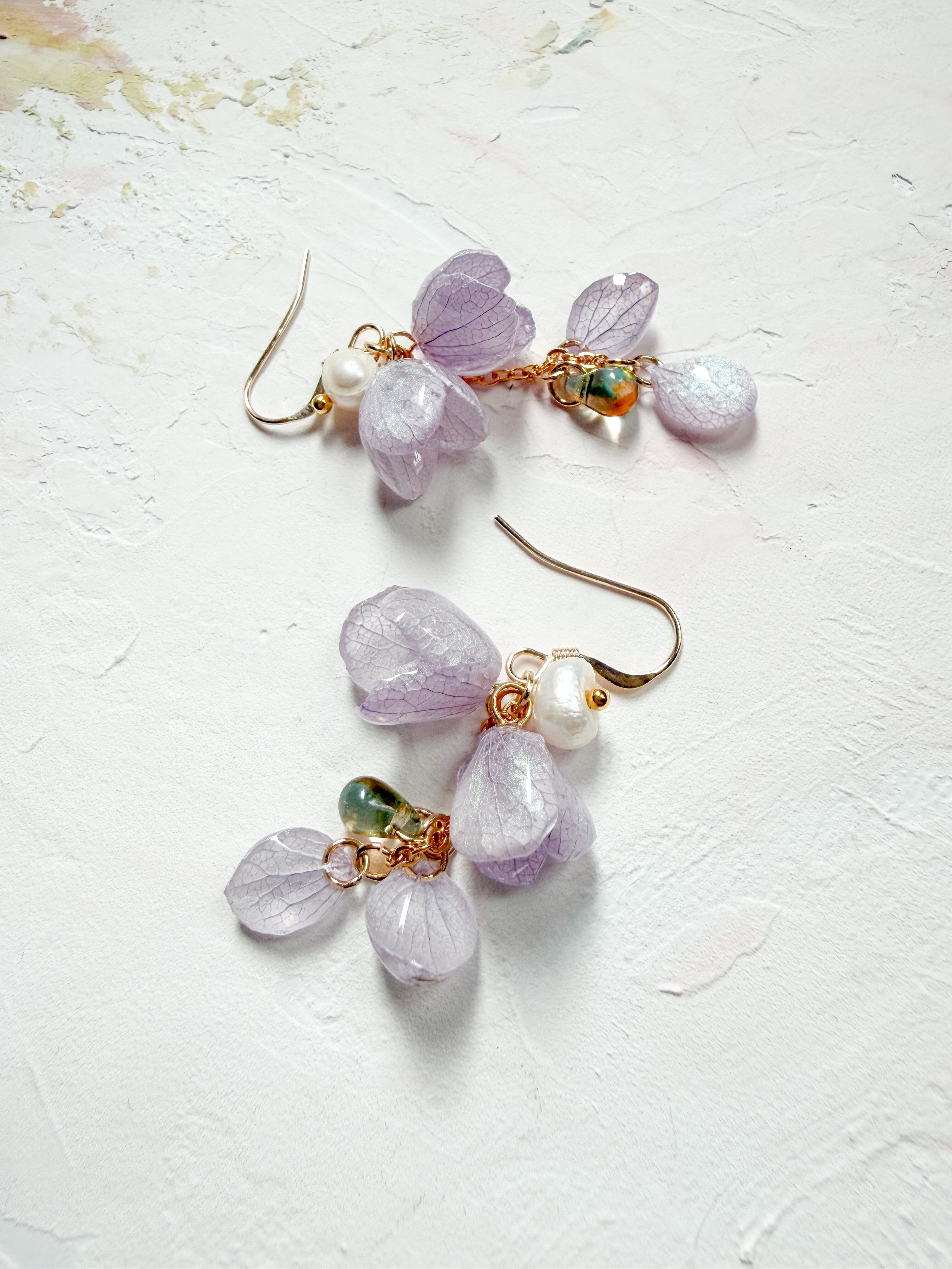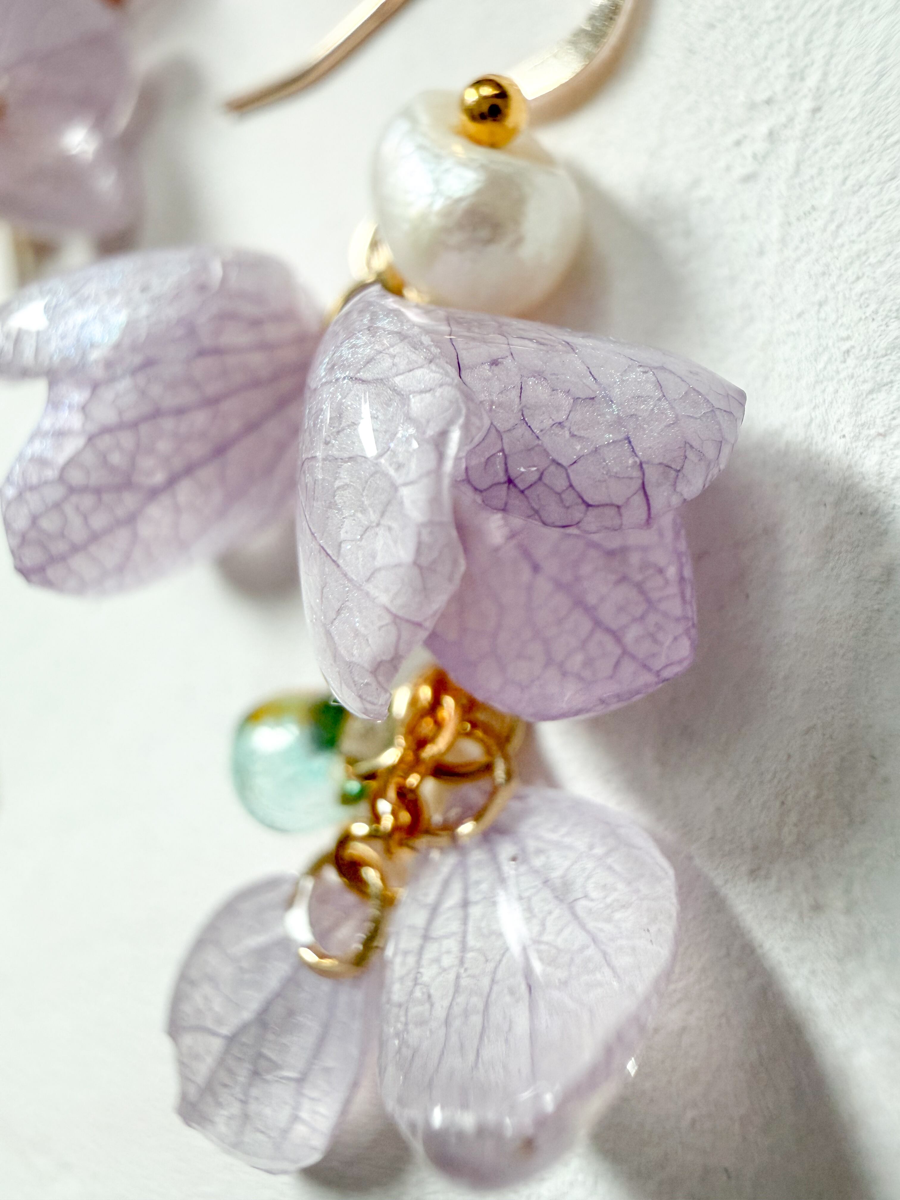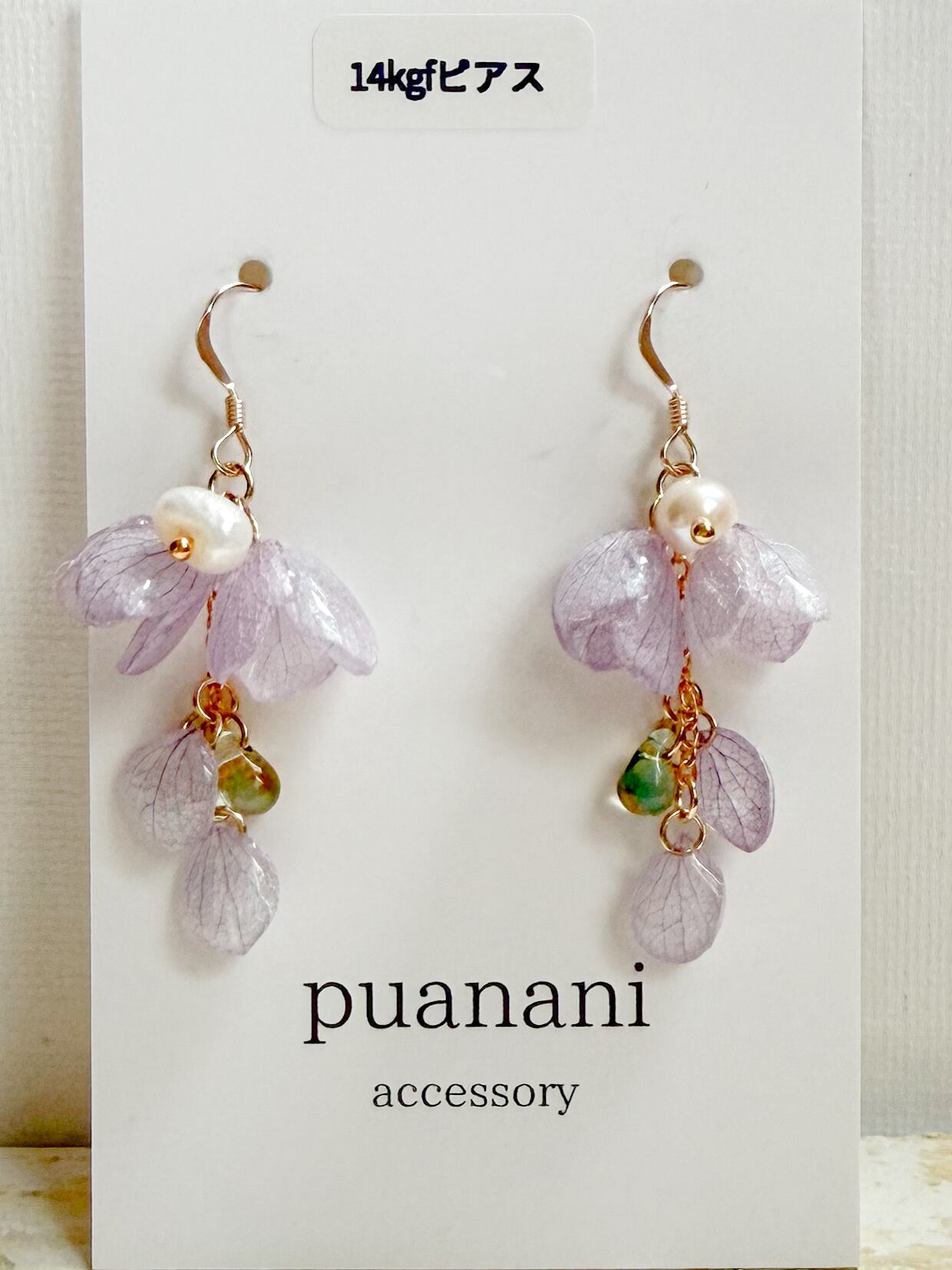 神秘的な「紫」をテーマにした、あじさいベルのピアスとイヤリングが新たに登場しました!あじさいの優雅な花びらをイメージし、14kgfのピアスまたは16kgpのイヤリングからお好みでお選びいただける特別なアイテムです。花びらビーズやチェコビーズ、さらに淡水パールの組み合わせが、あなたのスタイルに華やかなアクセントをもたらします。