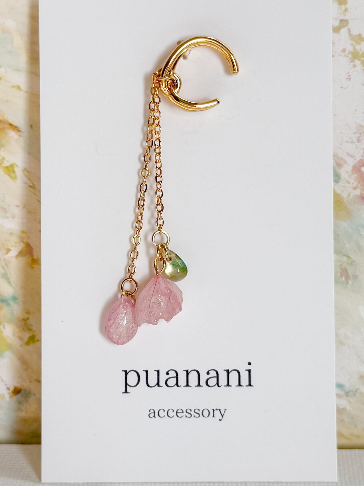 春の訪れを感じさせる「桜 イヤーカフ」が新たに登場しました!このイヤーカフは、ピンクのあじさいの花びらを丁寧に成形し、つぼみと花びらビーズが揺れるデザインが特徴です。金具には16kgpを使用しており、華やかでありながら肌に優しい一品です。手作りで心を込めて仕上げられた特別なアクセサリーで、あなたのスタイルに春の彩りを加えます。